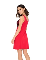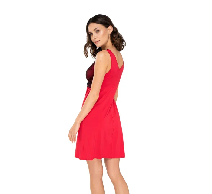 Efektní noční košilka Valerie v červeno-černé barvě s tvarovaným střihem a hlubokým výstřihem do V zdůrazněným krajkovým lemem i černým puntíkovaným tylem, s elegantní a decentní spodní částí, hladká a volná. 94 % viskóza, 6 % elastan.