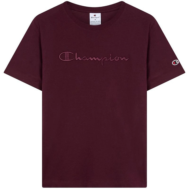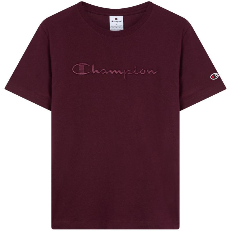 Dámské tričko Champion SS Tee bordó 118382 RS522 Tričko Champion je tričko pro každodenní nošení, má přizpůsobený střih, kulatý výstřih, měkký materiál, velké vyšívané logo na hrudi a decentní nášivku na rukávu.