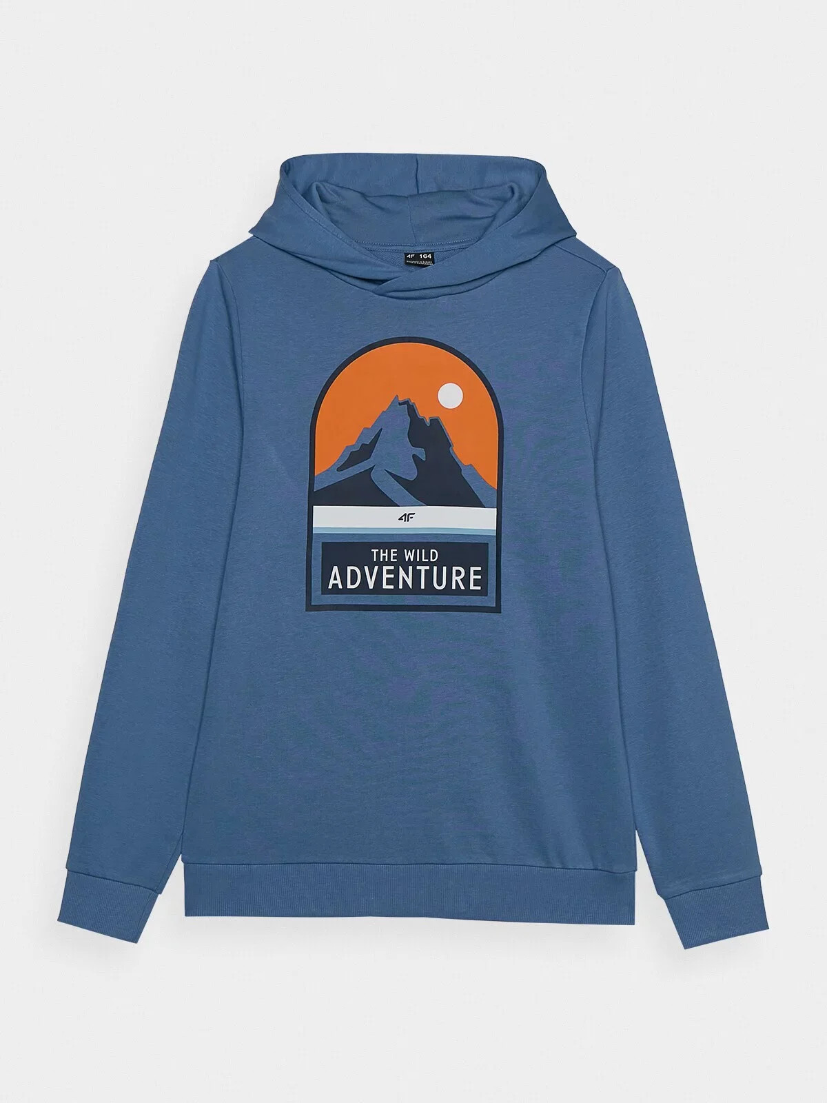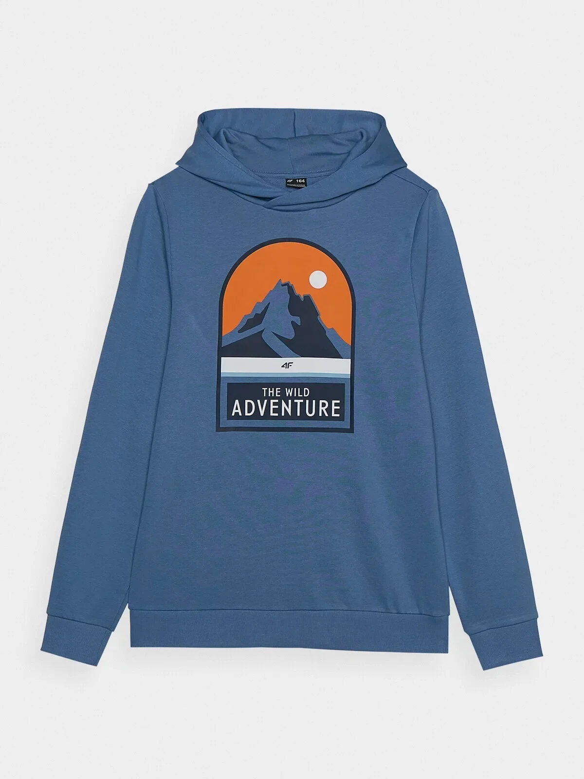 Integrovaná kapuce u výstřihu. Elastické žebrované manžety. Na přední straně je viditelný potisk "The Wild Adventure". Klasický střih bez kapes. Mikina přes hlavu. Spodní část s širokým lemem