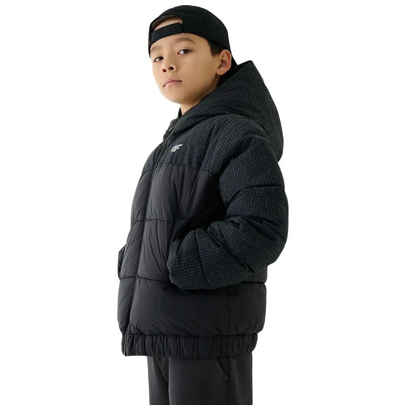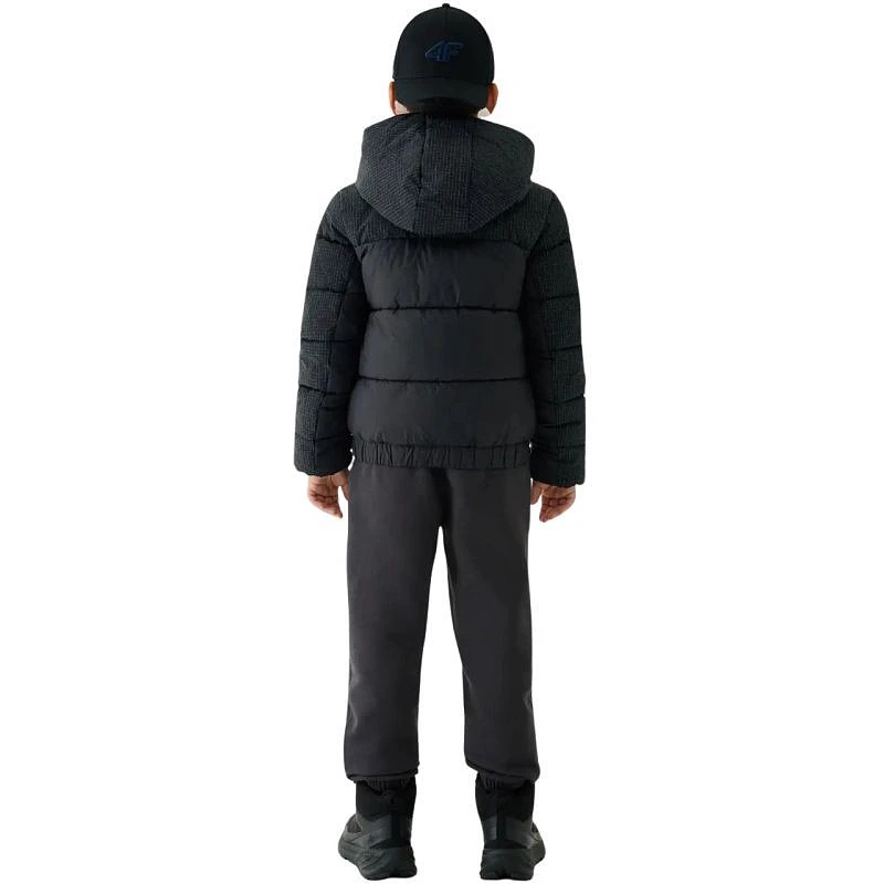 Kurtka puchowa dla chłopca 4F M621 głęboka czerń 4FJWAW25TDJAM621 20S Kurtka 4F dla chłopca sprawdzi się w chłodne dni w okresie jesienno-zimowym. Syntetyczny puch zamknięty w poziomych, szerokich panelach w połączeniu z technologią 4FWarm gwarantuje ochronę przed zimnem, oddychalność. Hydrofobowa impregnacja materiału. Strefowe wzmocnienia z tkaniny rip-stop. Regularny fason. Dół z elastyczną gumką. Nieodpinany kaptur zintegrowany z wysokim kołnierzem. Długi zamek daje możliwość indywidualnej termoregulacji. Dwie kieszenie boczne tworzą dodatkowa przestrzeń dla drobiazgów. Dane techniczne:· Materiał główny: 100% poliamid· Materiał główny 2: 93% poliamid, 7% poliester· Podszewka: 100% poliester· Wypełnienie: 100% poliester (puch syntetyczny)