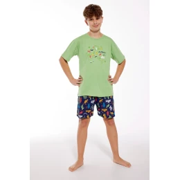 Chlapecké pyžamo ušité z vysoce kvalitní bavlny. Tričko s krátkým rukávem a ozdobným potiskem na hrudi. K tomu krátké vzorované šortky. Pyžamo zabalené v krabici.