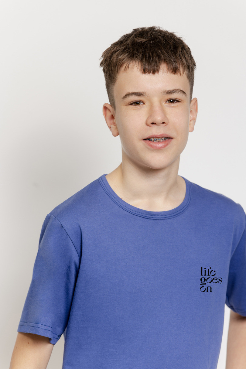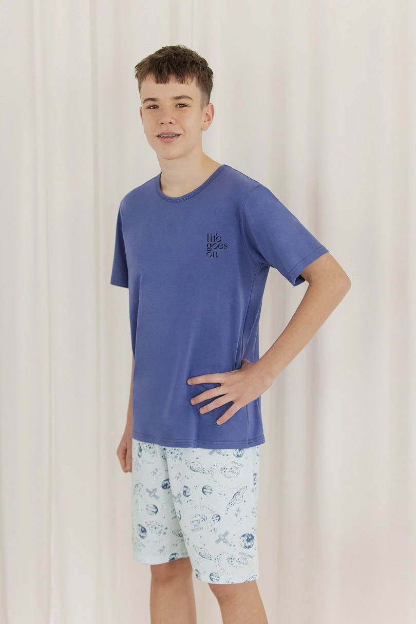 Tričko v módní modré barvě má klasický kulatý výstřih a decentní potisk "Life goes on" na hrudi, který působí moderně a mladistvě. Kvalitní bavlna je měkká, prodyšná a šetrná k pokožce, takže pyžamo je pohodlné na celou noc.