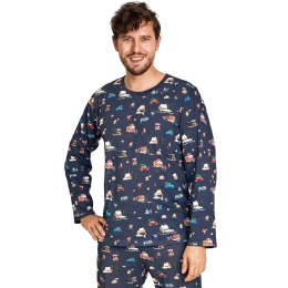 Chlapecké pyžamo 2839 Mikolaj Taro - vyrobené z vysoce kvalitní a měkké bavlny - tričko je tmavě modré barvy s dlouhými rukávy - zdobené barevným potiskem - dlouhé kalhoty s barevným potiskem - pohodlná guma v pase