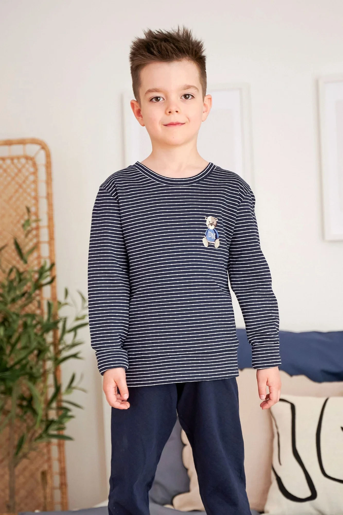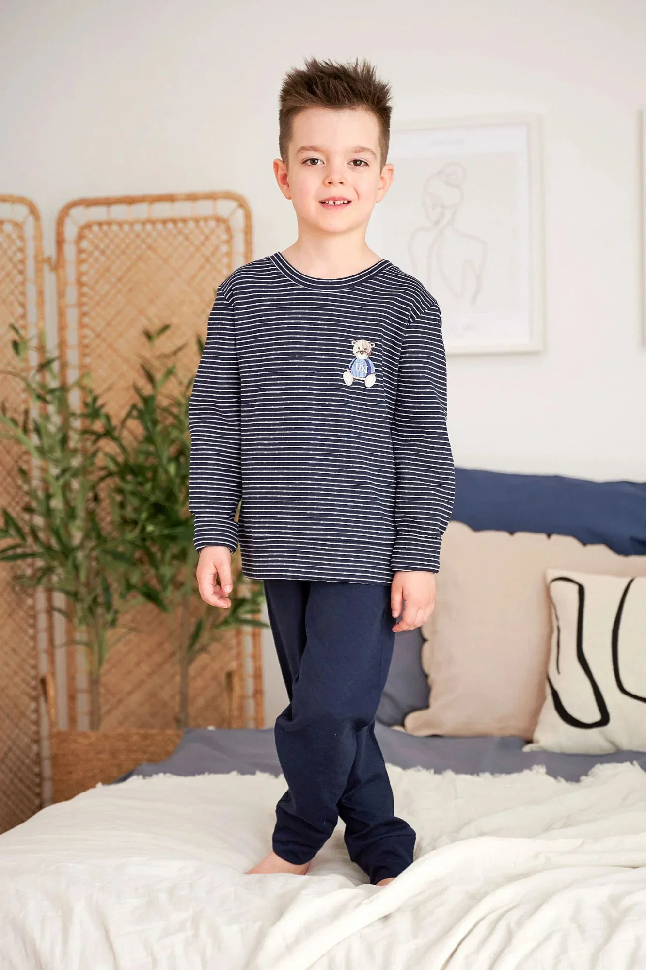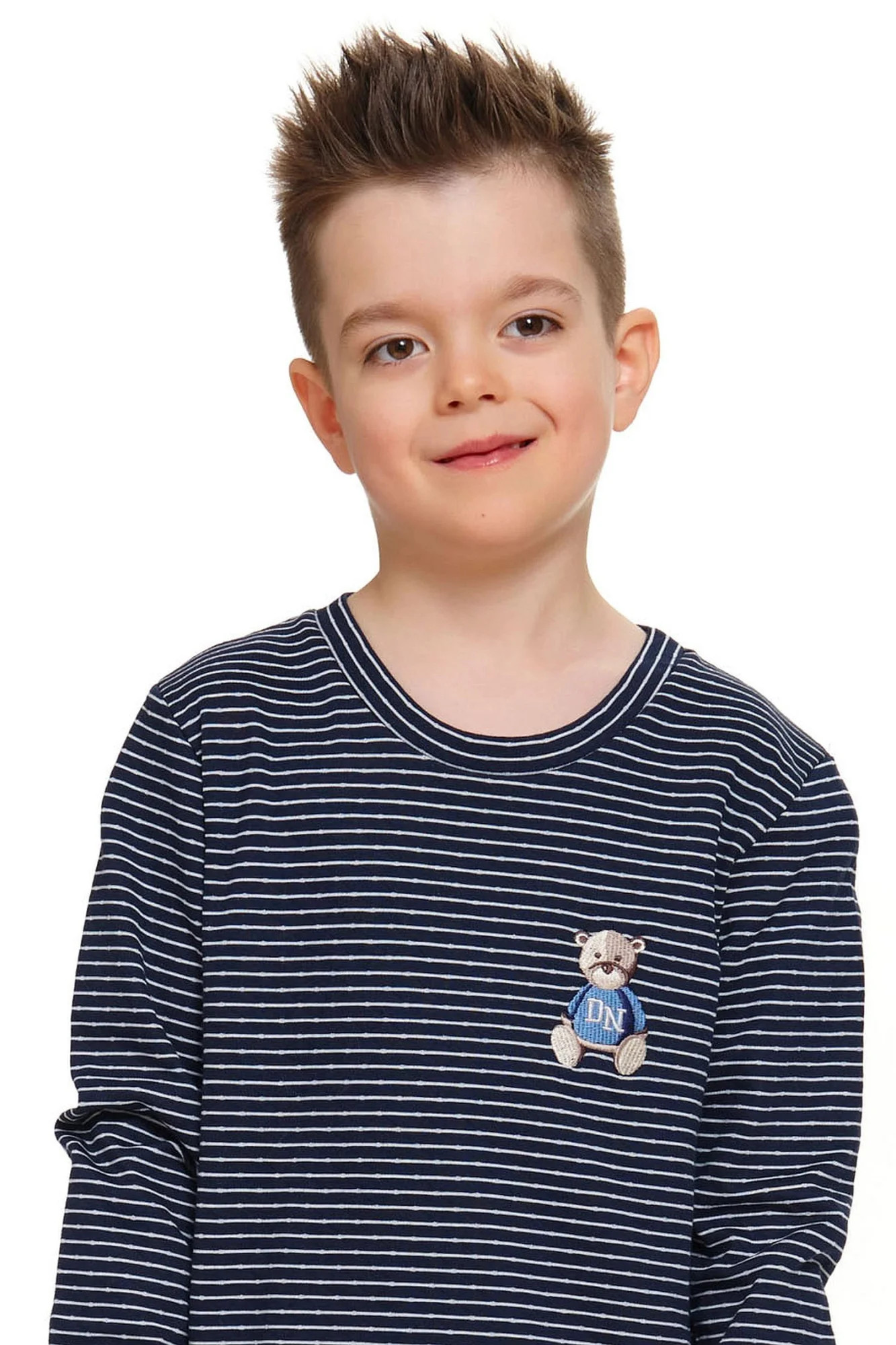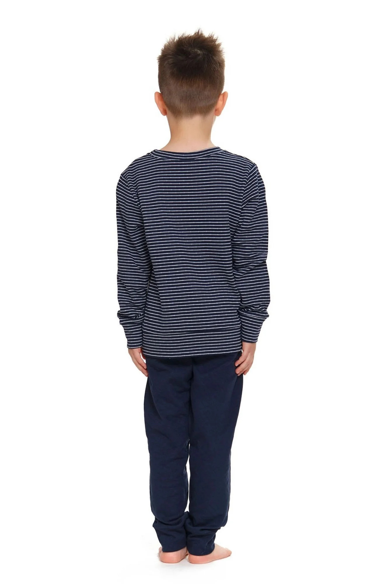 Chlapecké pyžamo 5256 Doctornap - tmavě modrá barva - vyrobené z velmi kvalitní a příjemné bavlny - pruhované tričko s dlouhými rukávy - na přední straně ozdobené potiskem - dlouhé tamvé kalhoty - certifikát OEKO-TEX Standard 100