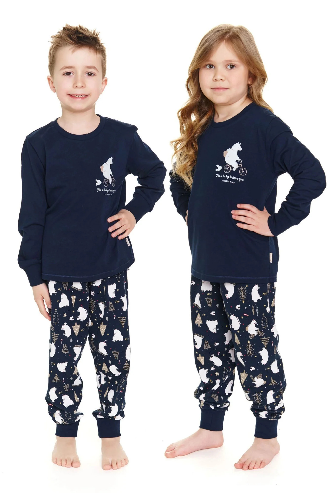 Chlapecké pyžamo 5264 Doctornap - z velmi kvalitní bavlny - tmavě modré tričko s dlouhými rukávy - zdobené potiskem na přední straně - dlouhé vzorované kalhoty s kapsami - rukávy a nohavice zakončené manžetami - vánoční motiv - certifikát OEKO-TEX Standard 100