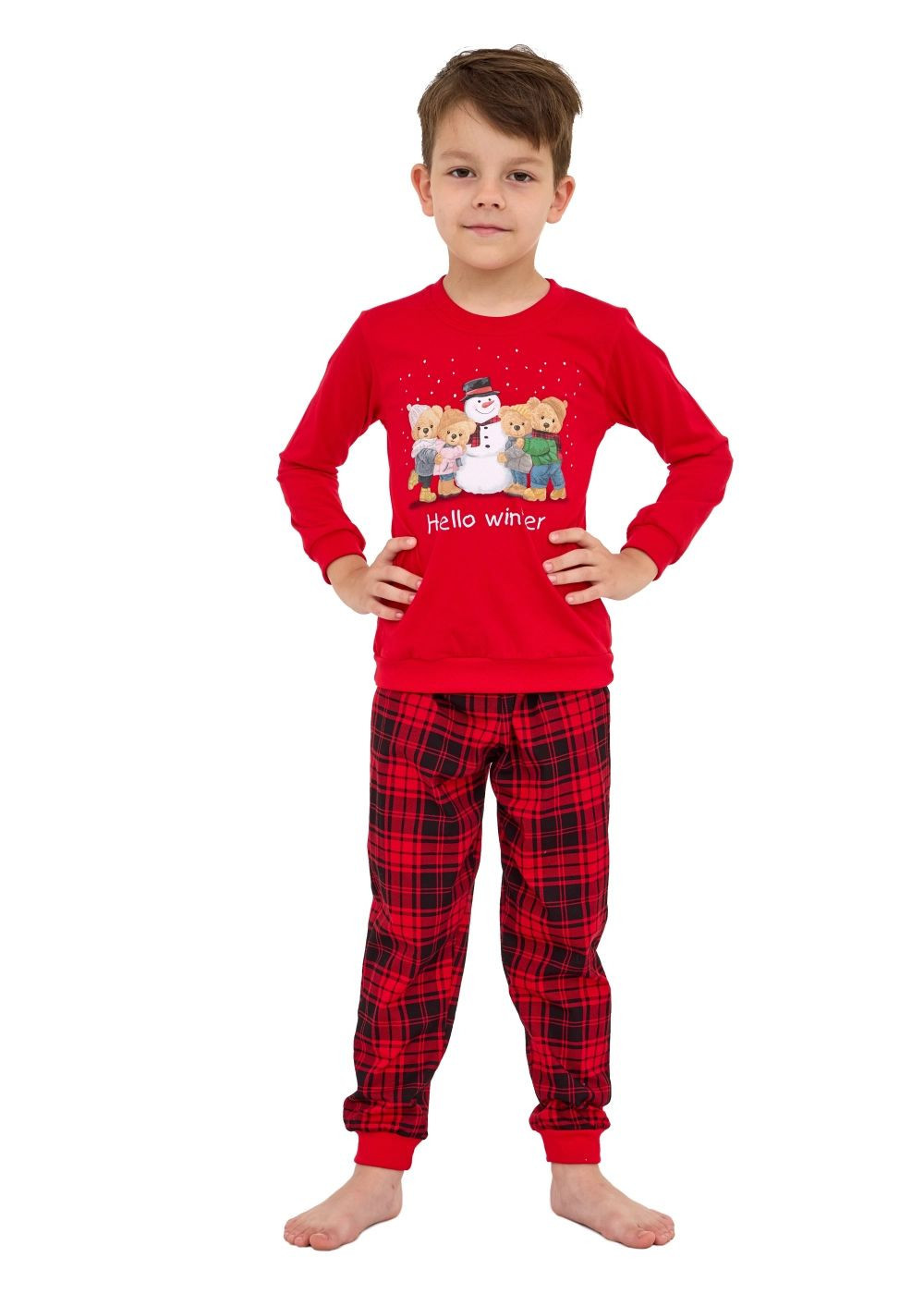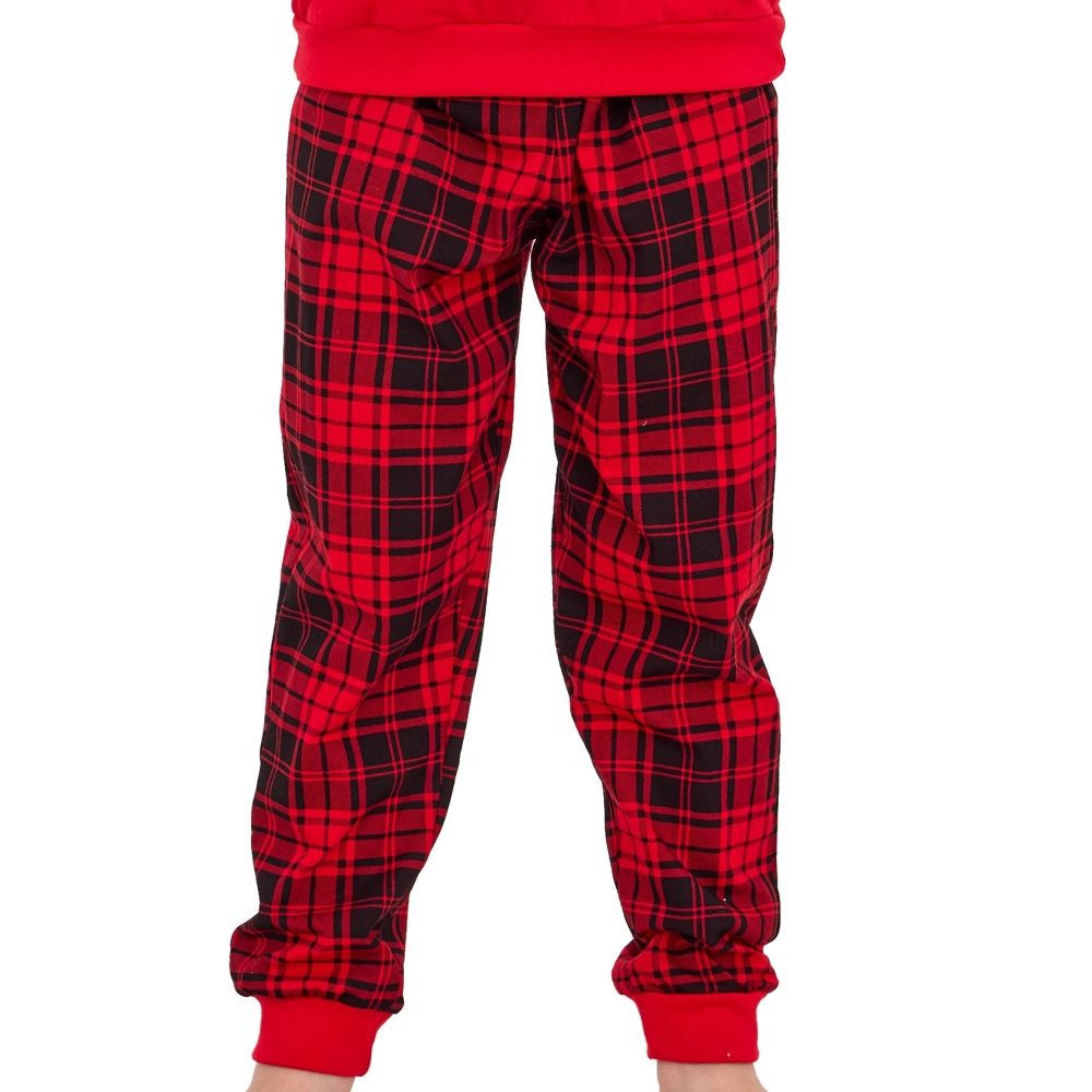 Chlapecké pyžamo 593/171 Winter CORNETTE - z vysoce jakostní bavlny - červené tričko s dlouhými rukávy - kulatý výstřih - přední strana ozdobená potiskem - dlouhé kárované nohavice zakončené stahovacím lemem