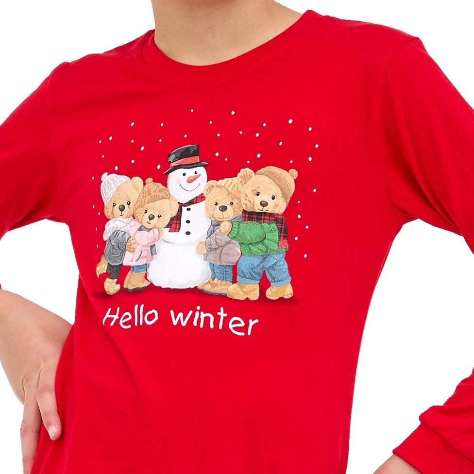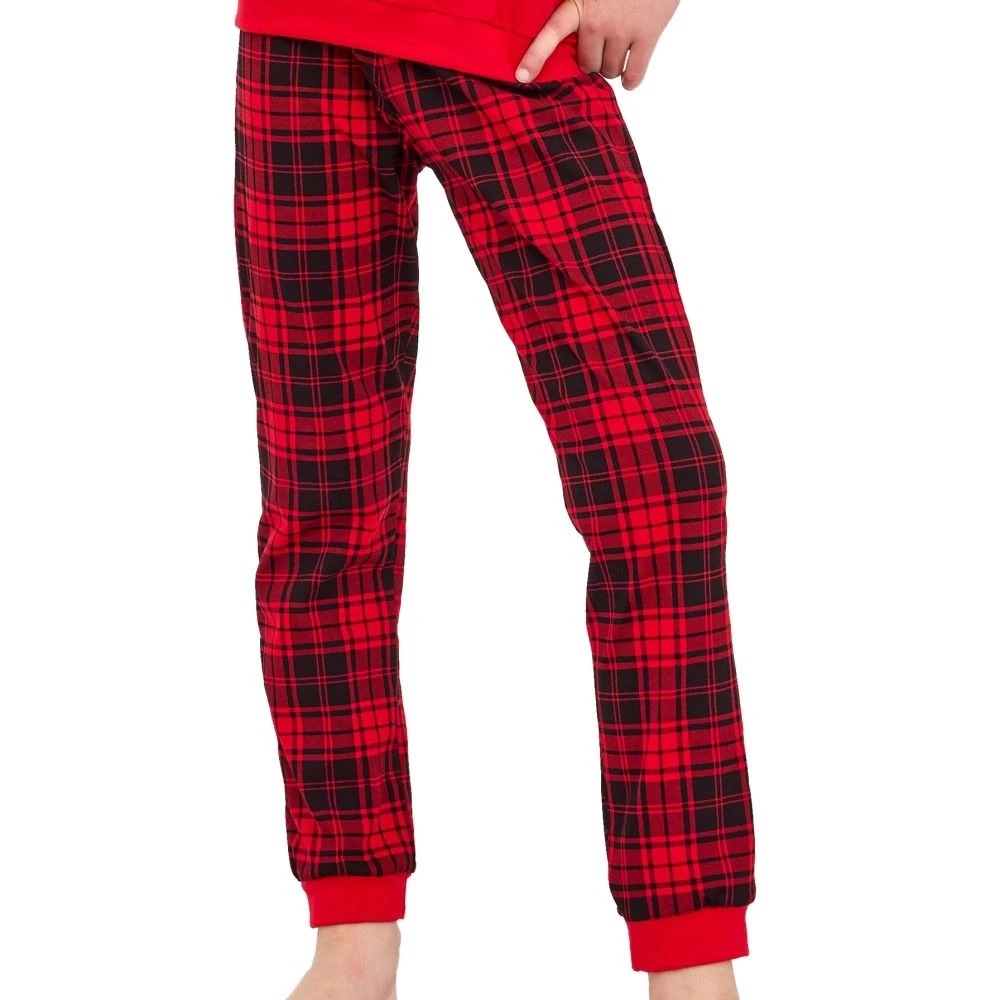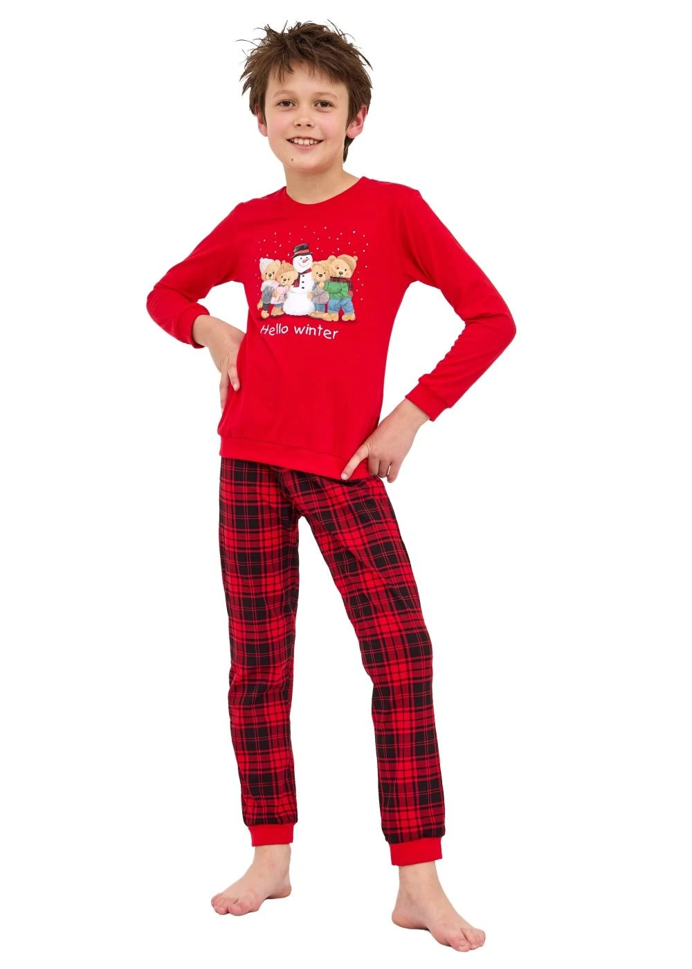 Chlapecké pyžamo 966/171 Winter CORNETTE - z vysoce jakostní bavlny - červené tričko s dlouhými rukávy - kulatý výstřih - přední strana ozdobená potiskem - dlouhé kárované nohavice zakončené stahovacím lemem
