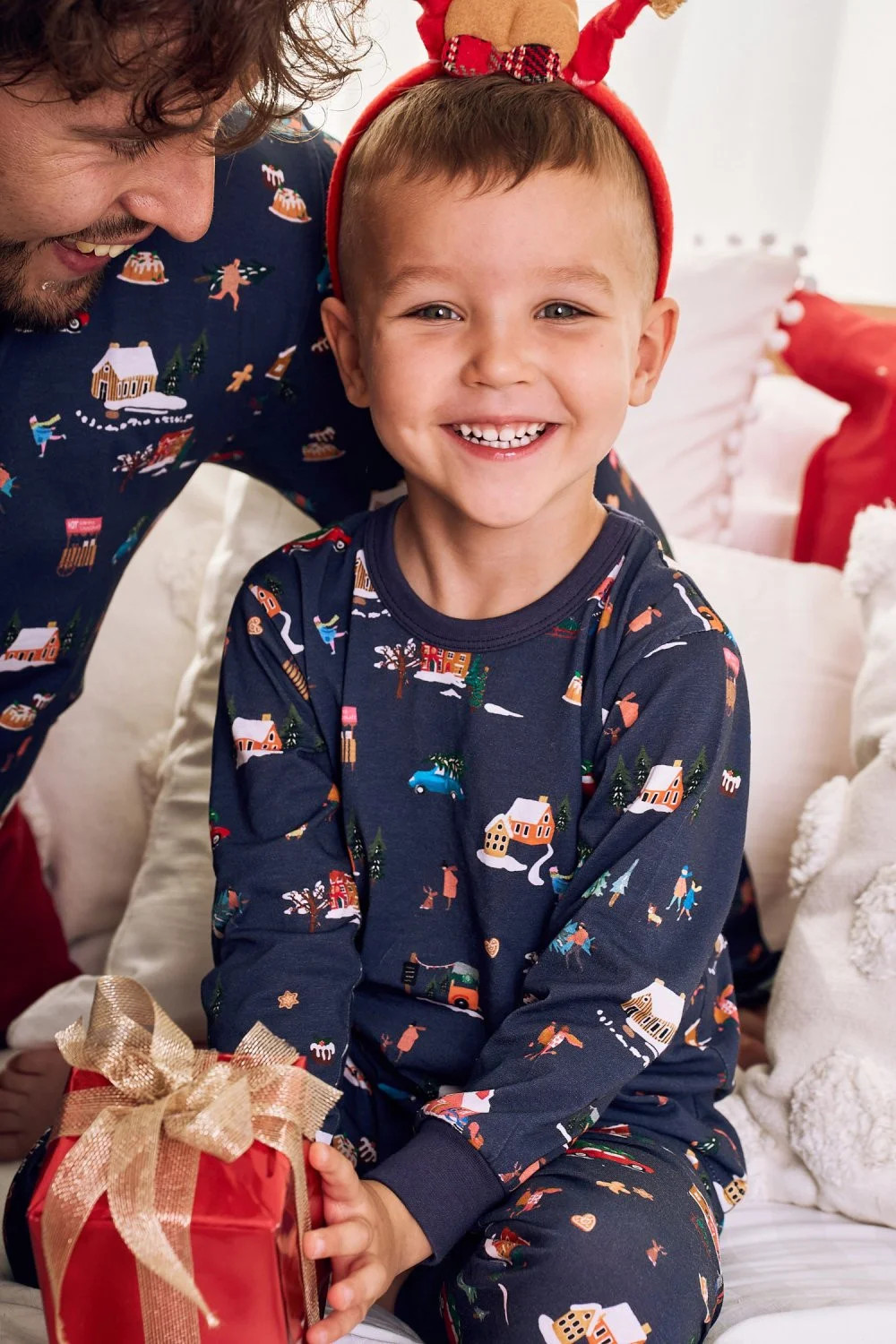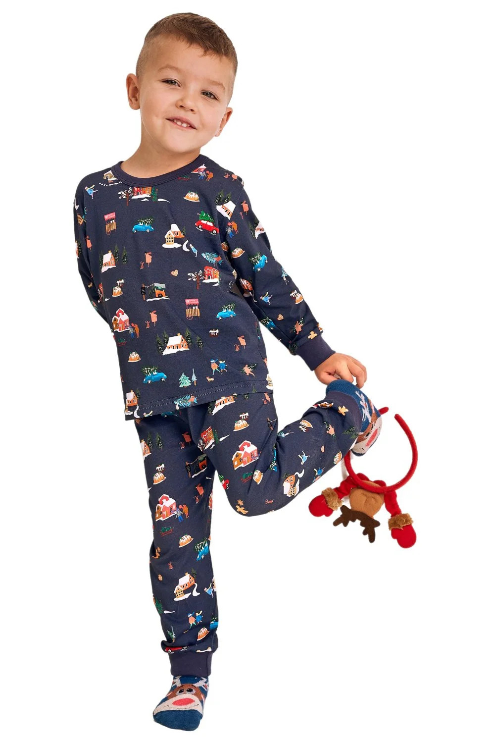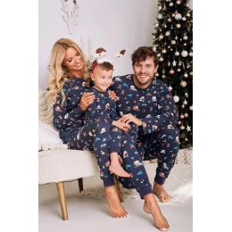 Chlapecké pyžamo 2838 Mikolaj Taro - vyrobené z vysoce kvalitní a měkké bavlny - tričko je tmavě modré barvy s dlouhými rukávy - zdobené barevným potiskem - dlouhé kalhoty s barevným potiskem - pohodlná guma v pase