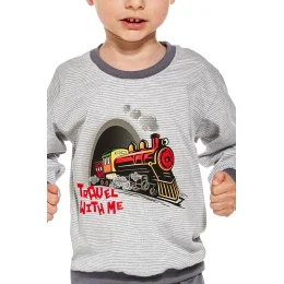 Chlapecké pyžamo 478/145 Train CORNETTE - vyrobené z vysoce kvalitní a měkké bavlny - tričko je šedé barvy s dlouhými rukávy - zdobené barevným potiskem a proužky - dlouhé kalhoty mají pohodlnou gumu v pase
