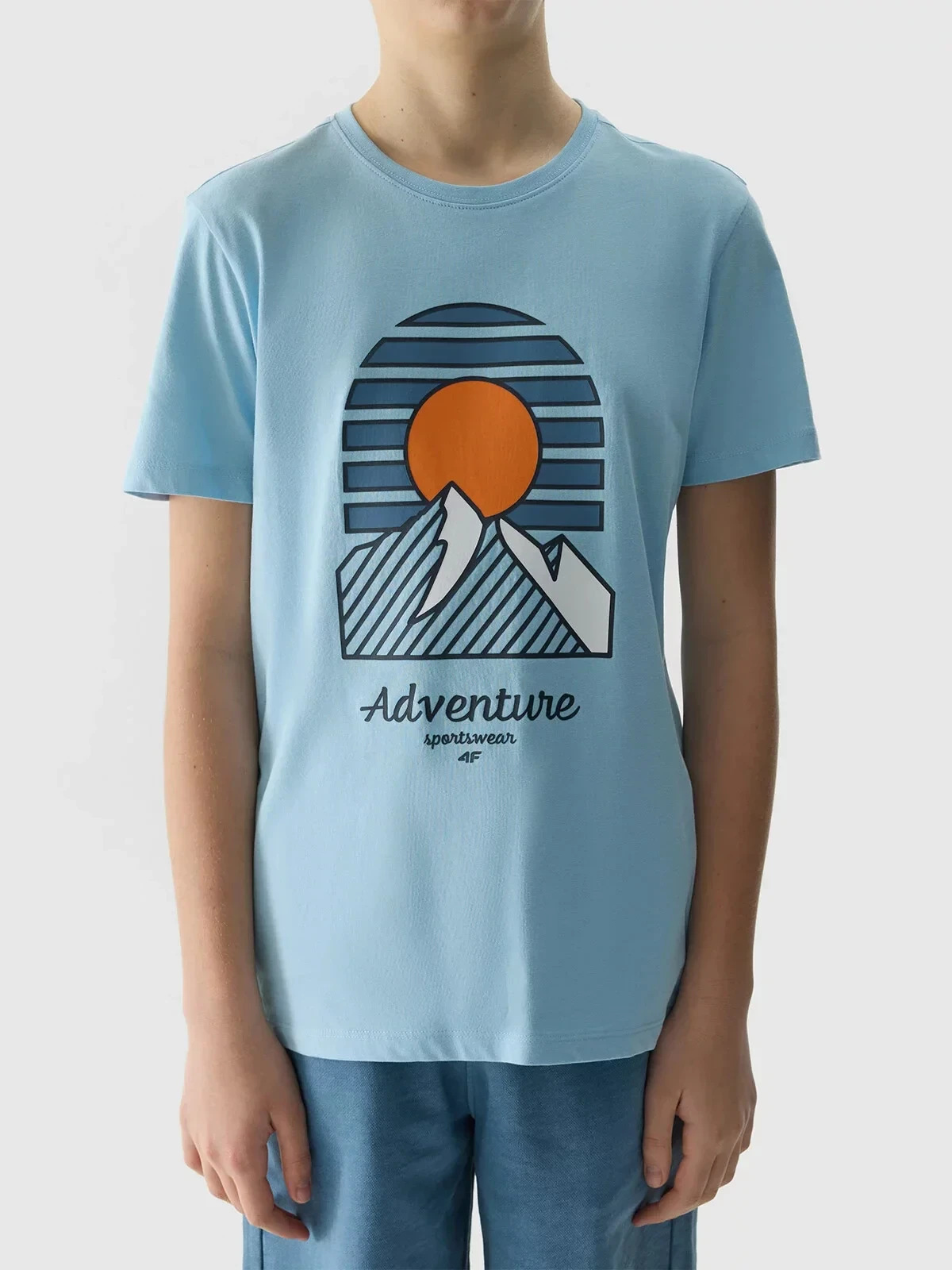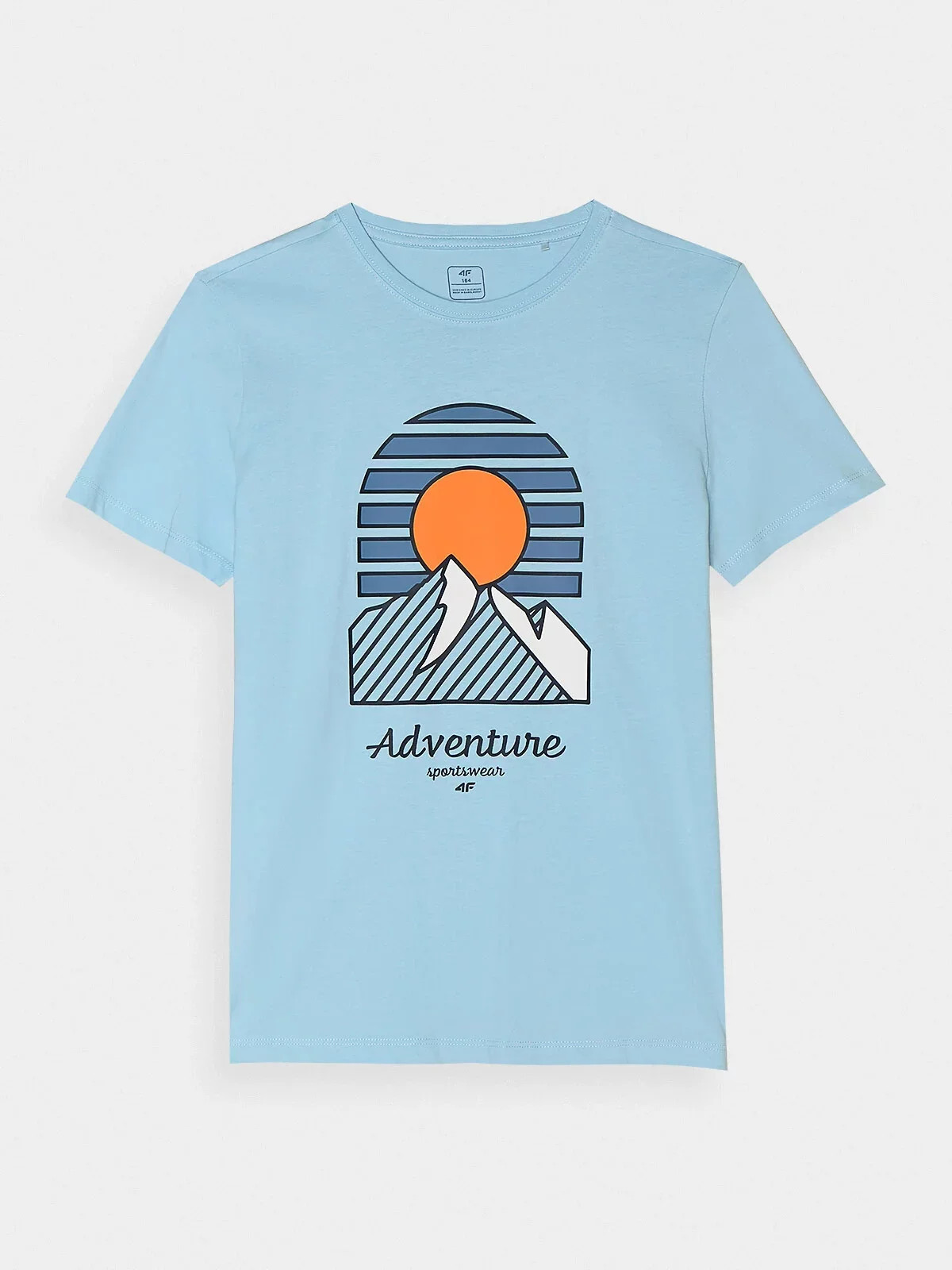 Na přední straně je viditelný potisk s motivem hor a nápis "Adventure sportswear 4F".