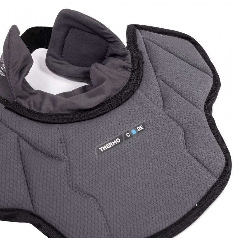 Ochraniacz szyi bramkarski Bauer Elite Sr Ochraniacz na szyję Bauer Elite Senior Goalie Neck Guard to świetna opcja dla bramkarzy którzy nie muszą nosić certyfikowanego ochraniacza szyi, ale chcą aby ich obojczyk był dodatkowo chroniony Materiał zewnętrzny Osłona obojczyka Elite jest wykonana z wytrzymałego, odpornego na ścieranie nylonu na wierzchu, podczas gdy tylna strona wykorzystuje ThermoMax firmy Bauer, aby zapewnić Ci odpowiednią wentylacje przez cały czas gry Warto zwrócić uwagę na zastosowanie nowego, znacznie trwalszego rzepa niż w przypadku pozostałych ochraniaczy Bauera. Kołnierz i obojczyk Kołnierz jest znacznie krótszy niż osłona szyi Pro i wykorzystuje miękką wkładkę ThermoMax. W części obojczykowej zastosowano mieszankę Rebound Control Foam i innych pianek HD do Rozszerzona ochrona obojczyka Ergonomiczny kształt kołnierza Wewnętrzna wyściółka: THERMOMAX Materiał zewnetrzny: Nylon Certyfikat Nie Rozmiar: 13.5 "-15.5" / 34cm-39cm
