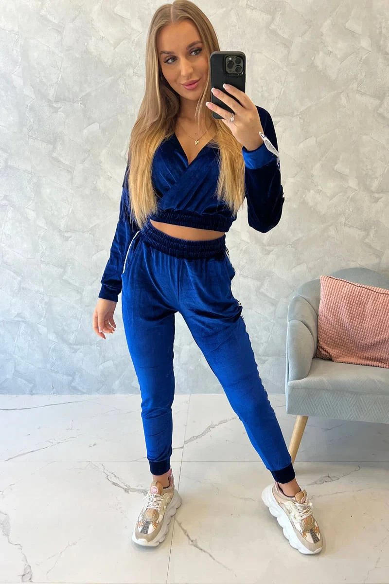 Představujeme vám sadu mikiny a kalhot. Sada z veluru. Mikina s výstřihem. Ozdobná stuha na ramenou s nápisem. Ve spodní části mikiny je všitá guma. Kalhoty s kapsami a páskou na nohavicích. Velmi módní a stylová sada. Sada je vyrobena z vysoce kvalitního materiálu. Velikost je univerzální a vyhovuje dámám velikosti S, M nebo L.