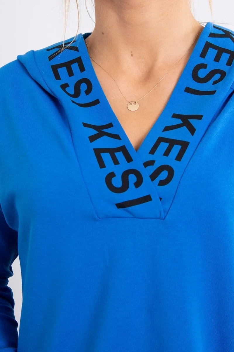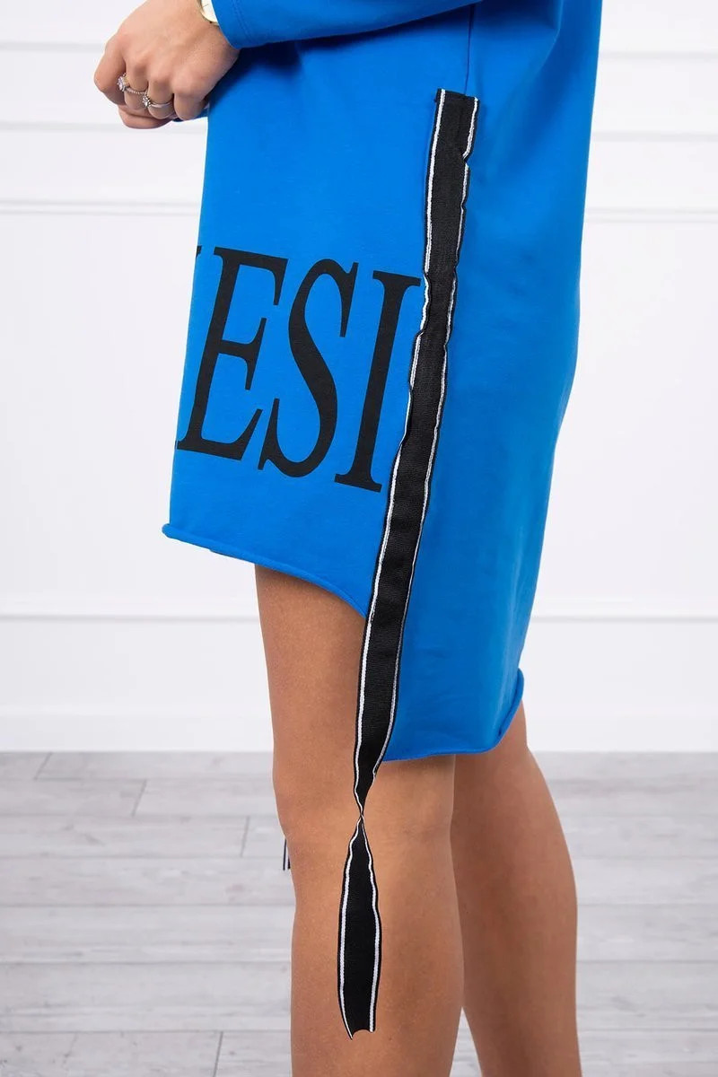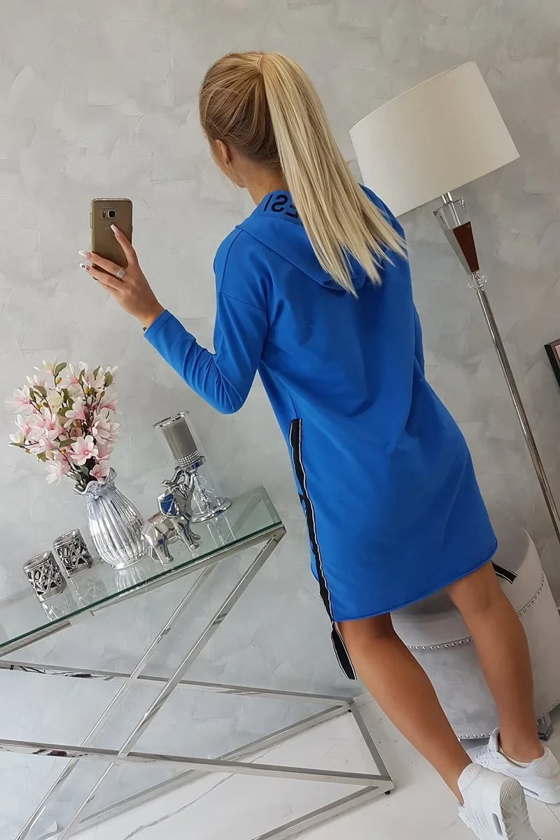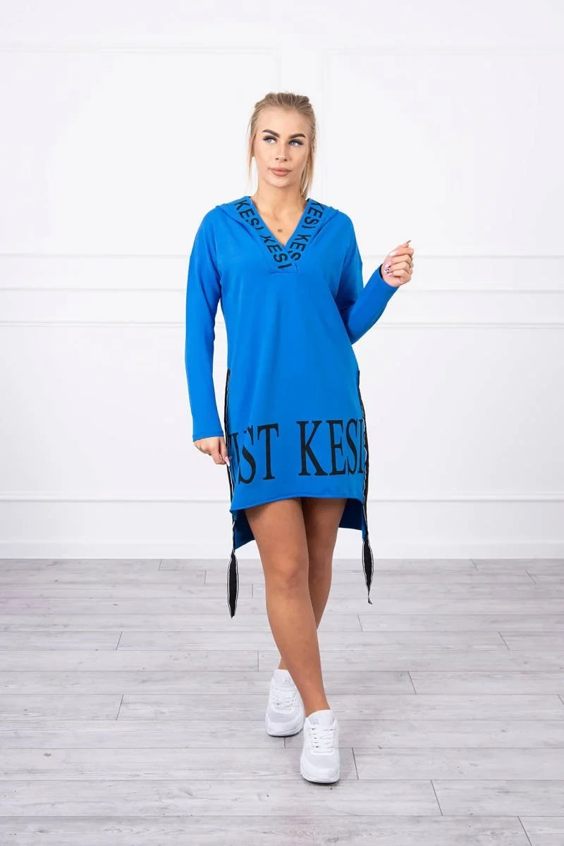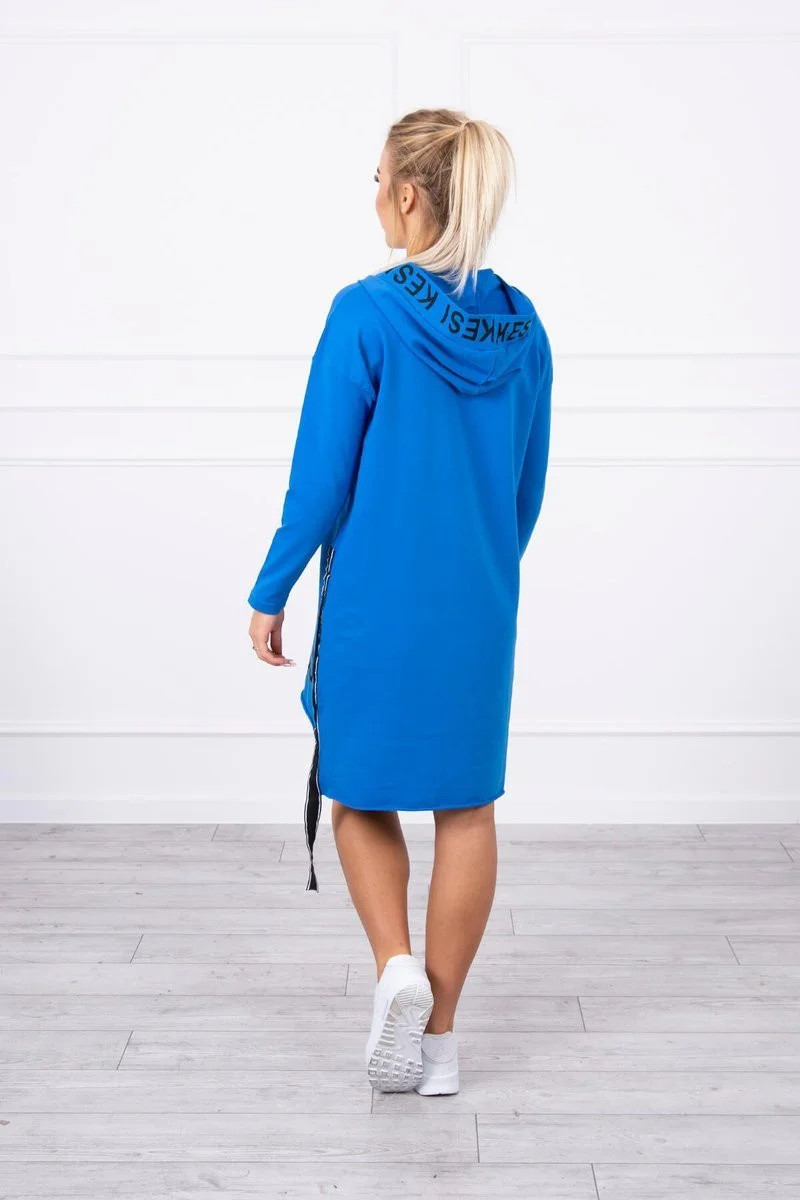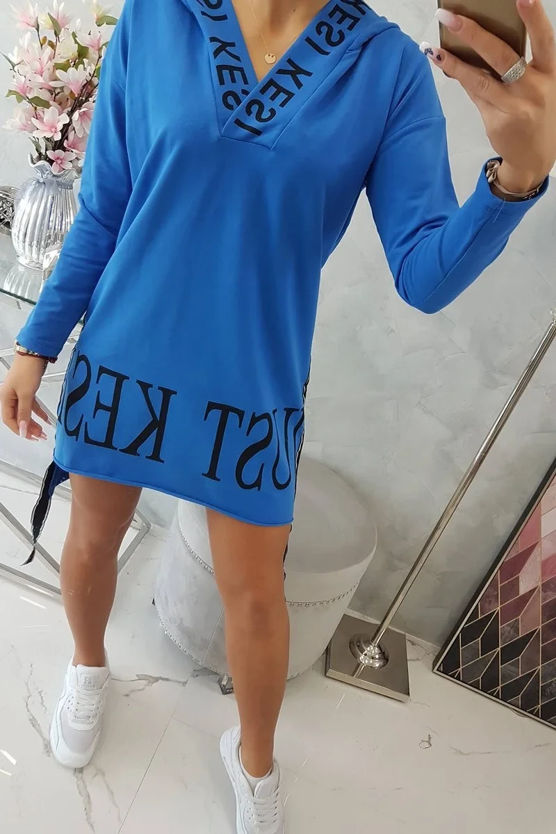 Chrpově modré šaty s kapucí a potiskem
