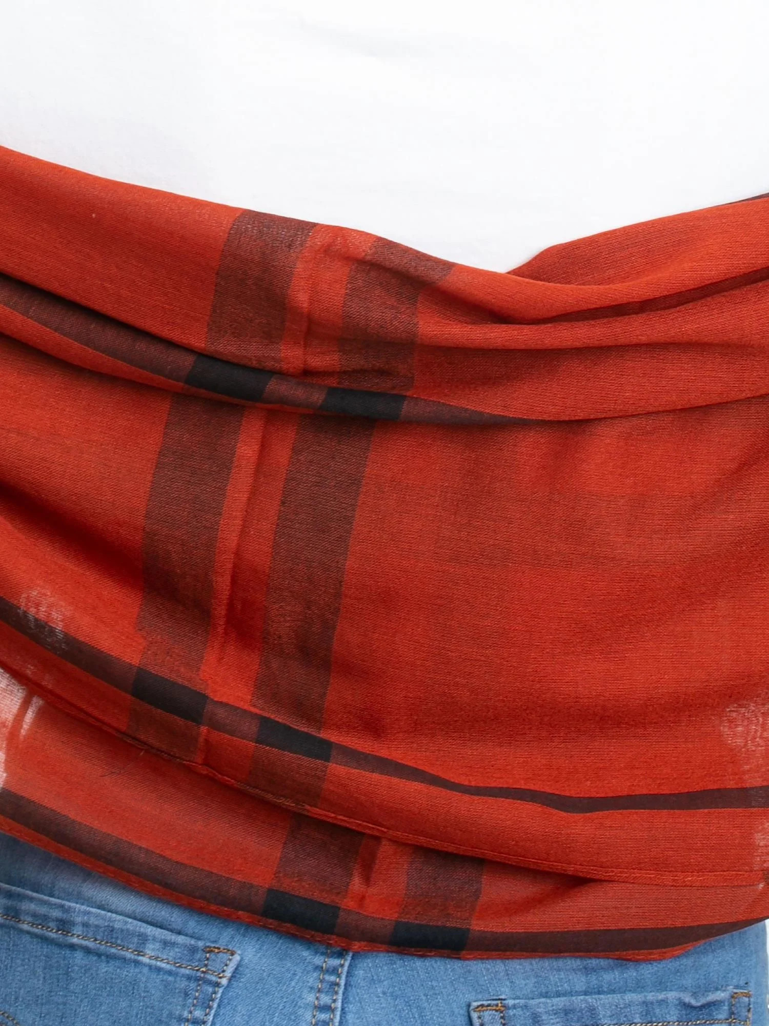 Brązowa chusta w kraciasty wzór.