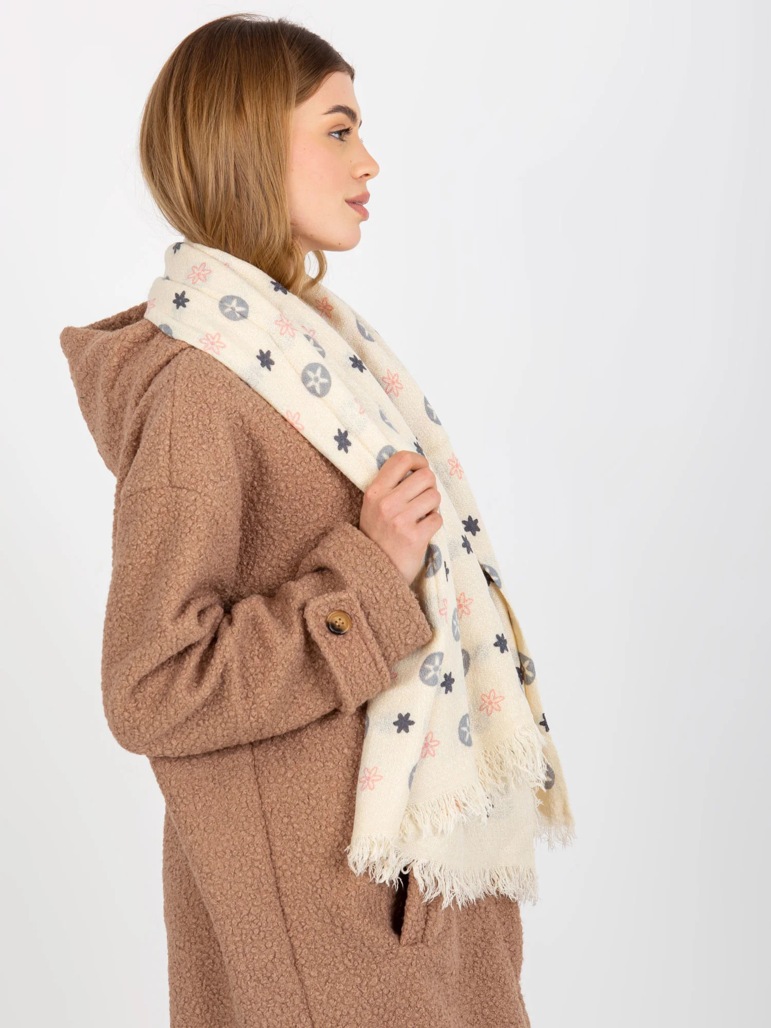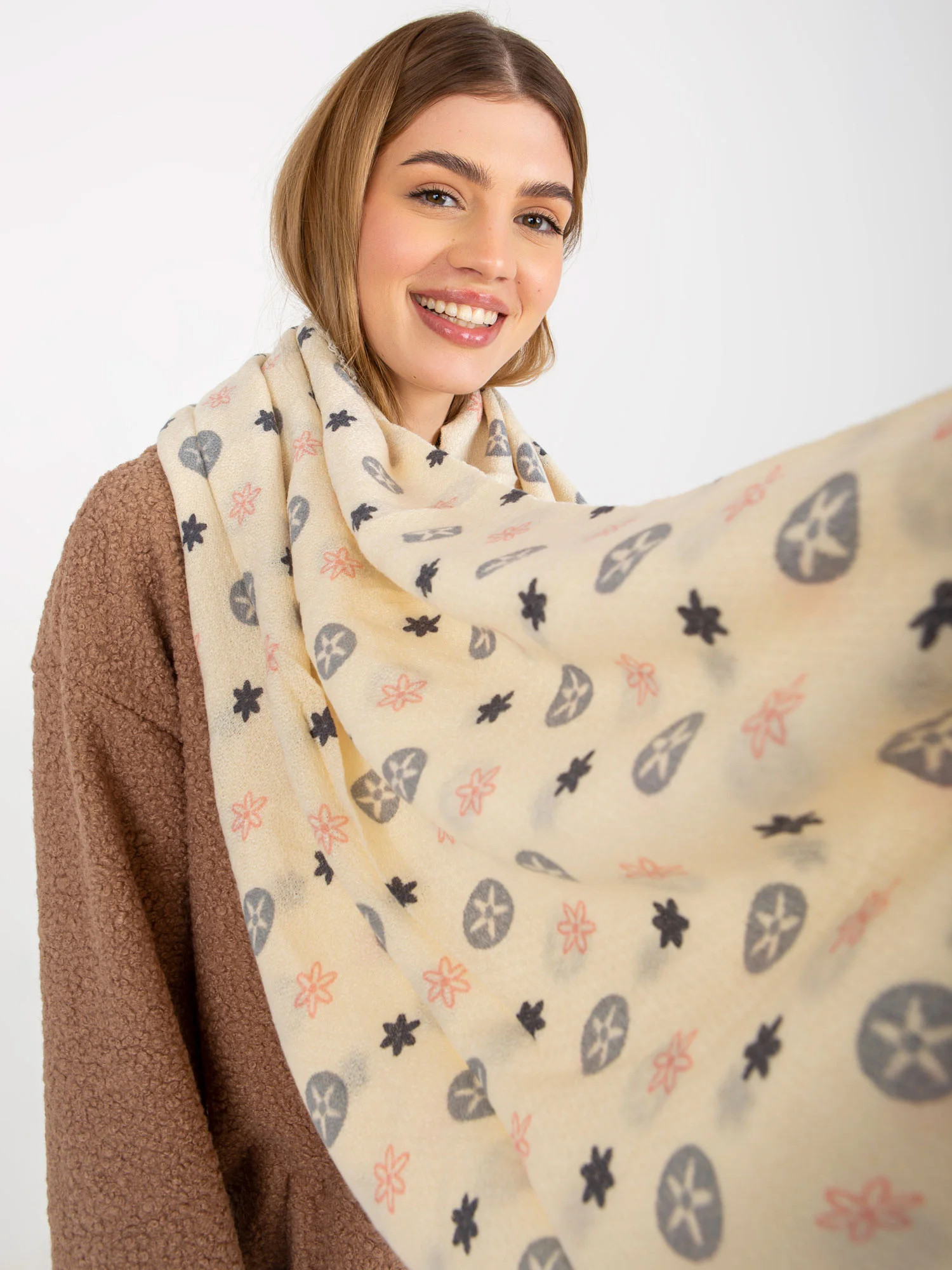 Ecru damski szal z printami .