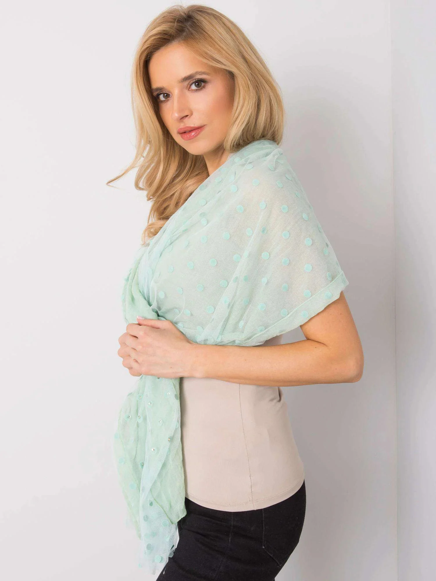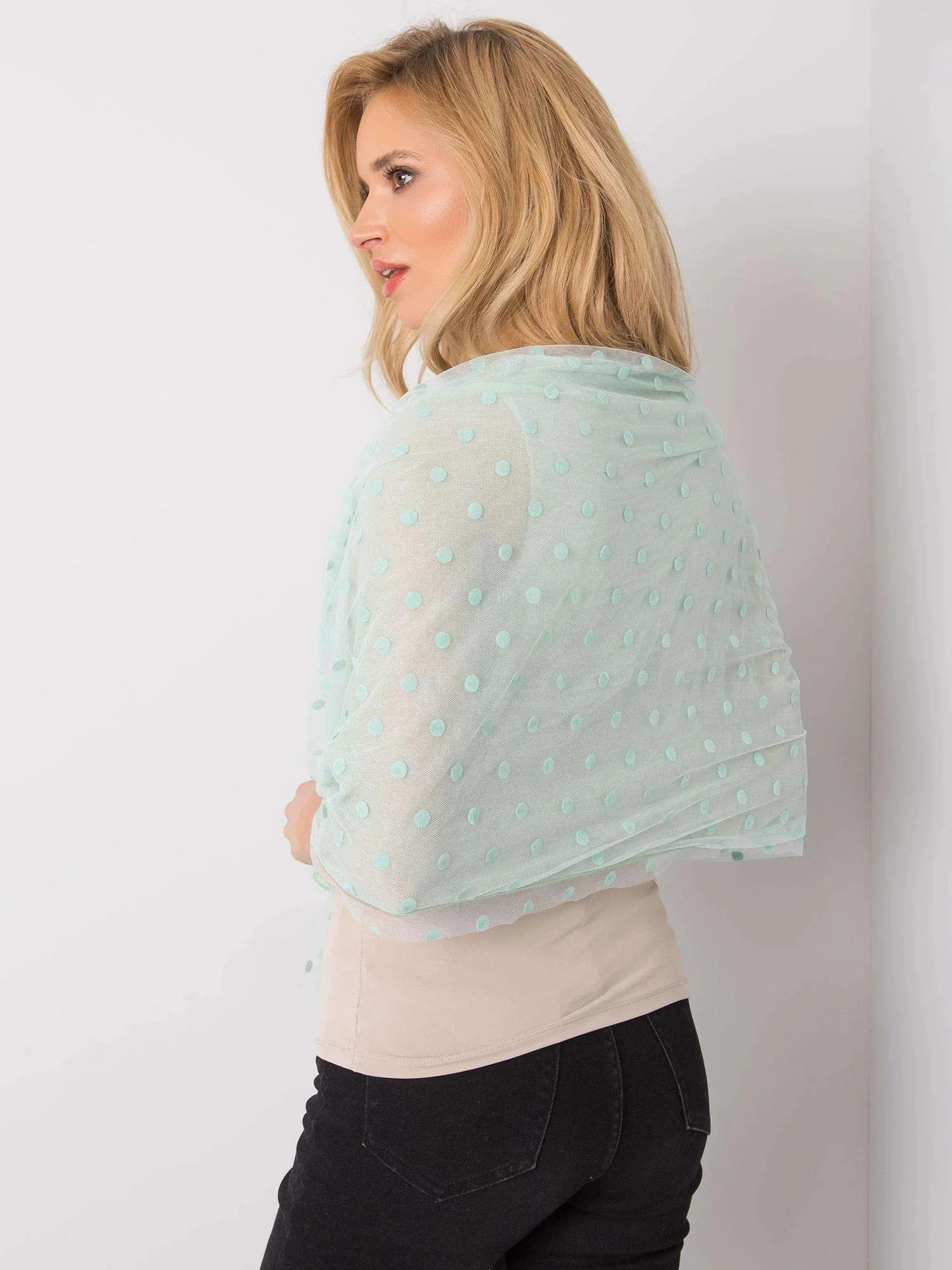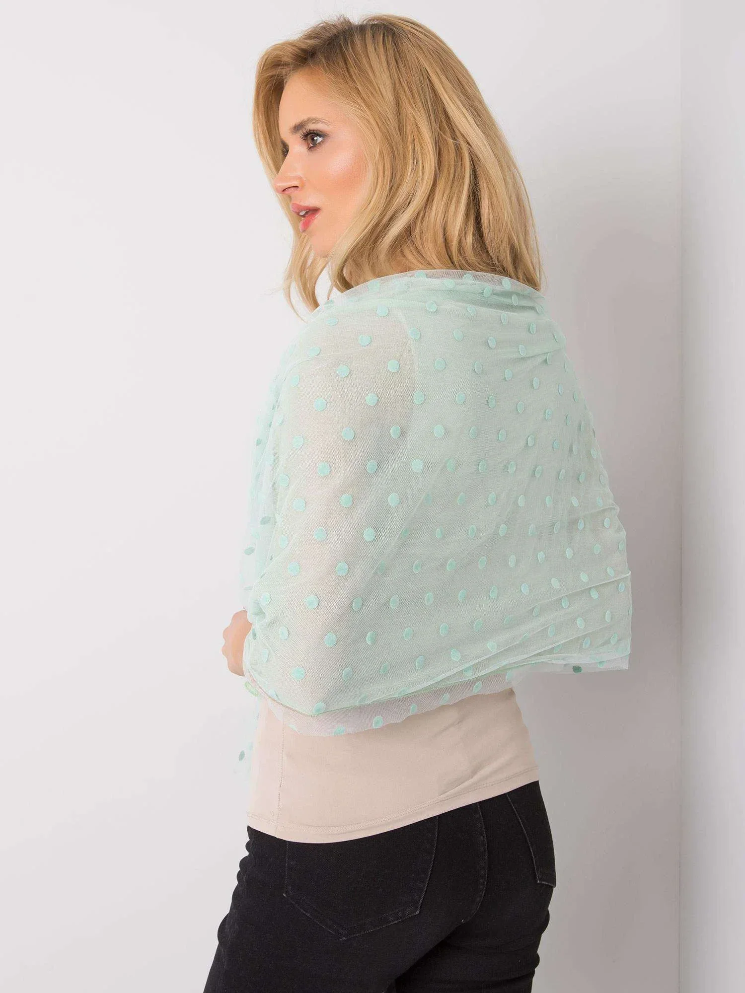 Miętowa chusta w grochy z aplikacją.