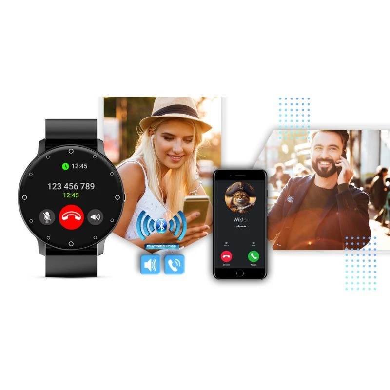 Po sparowaniu smartwatcha z twoim smartfonem, możesz bezproblemowo odbierać i wykonywać połączenia telefoniczne. Wbudowany głośnik oraz mikrofon pozwala rozmawiać bez konieczności wyciągania telefonu komórkowego. Gdy prowadzisz samochód, nie możesz rozmawiać przez telefon, jednak możesz rozmawiać przez smartwatch. Za jazdę gdy rozmawiasz przez telefon, możesz otrzymać wysoki mandat i punkty karne. Posiadanie tego modelu jest dużo tańsze niż mandat, tym bardziej gdy lubisz rozmawiać. Oprócz tego model ten posiada książkę telefoniczną oraz cyfrową klawiaturę. W ten sposób możesz wybierać numer do którego chcesz dzwonić z własnego smartwatcha. Ten smartwatch możesz połączyć ze swoim Smartfonem.Kompatybilność z systemem Android 5.0 i nowszy oraz iOS 9.0 i nowszy.Oznacza to, że smartwatch połączy się zewszystkimi telefonamina systemie ANDROID i iOS.