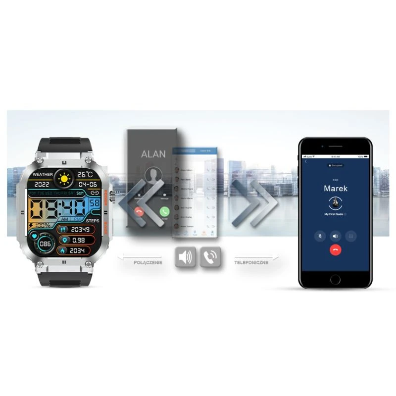 Ten smartwatch możesz połączyć ze swoim Smartfonem.Kompatybilność z systemem Android 5.0 i nowszy oraz iOS 8.0 i nowszy.Oznacza to, że smartwatch połączy się zewszystkimi telefonamina systemie ANDROID i iOS.