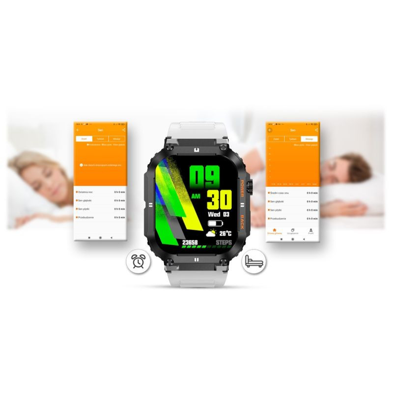 Funkcja ta pozwala monitorować czas i jakoś snu każdej nocy. Po zsynchronizowaniu danych z aplikacją możesz sprawdzać i analizować jakość swojego snu. Historia pokaże jak śpisz i czy twój sen jest dobrej jakości. Po ciężkim dniu każdy musi się wyspać, żeby nabrać sił na kolejny dzień i w tym pomoże Ci ten smartwatch.