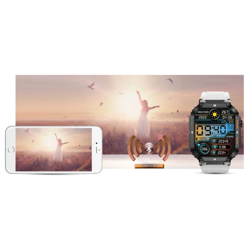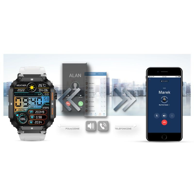 Ten smartwatch możesz połączyć ze swoim Smartfonem.Kompatybilność z systemem Android 5.0 i nowszy oraz iOS 8.0 i nowszy.Oznacza to, że smartwatch połączy się zewszystkimi telefonamina systemie ANDROID i iOS.