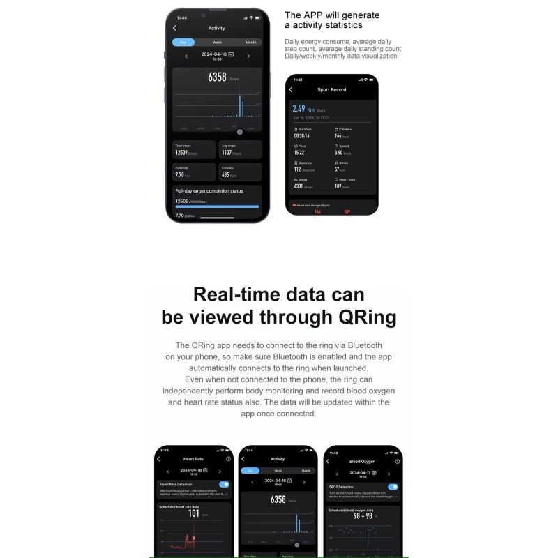 Data v reálném čase dostupná prostřednictvím aplikace QRing. I když prsten není právě připojen k telefonu, dokáže nezávisle monitorovat vaše tělo a zaznamenávat hladinu kyslíku v krvi a srdeční tep. Data budou synchronizována s aplikací při dalším připojení.