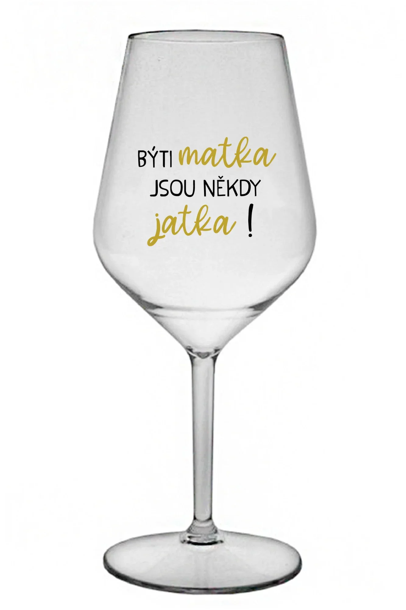 Nerozbitná čirá vinná sklenice s motivem BÝTI MATKA JSOU NĚKDY JATKA! je skvělá na zahradu, pláž, výlet, piknik a parádu udělá i při kempování. Jelikož je vyrobená z kvalitního polykarbonátu je de facto nerozbitná. Je to luxusní kousek, s nímž si víno můžete vychutnat prostě kdekoliv. Mají ergonomický tvar, který příjemně padne do ruky a protože je lehká, usnadňuje to její přenášení. Je snadno skladovatelná a lehce se čistí. Díky svému designu si s ní můžete vychutnat doopravdy kdekoliv bezproblémové pití výborného vína.