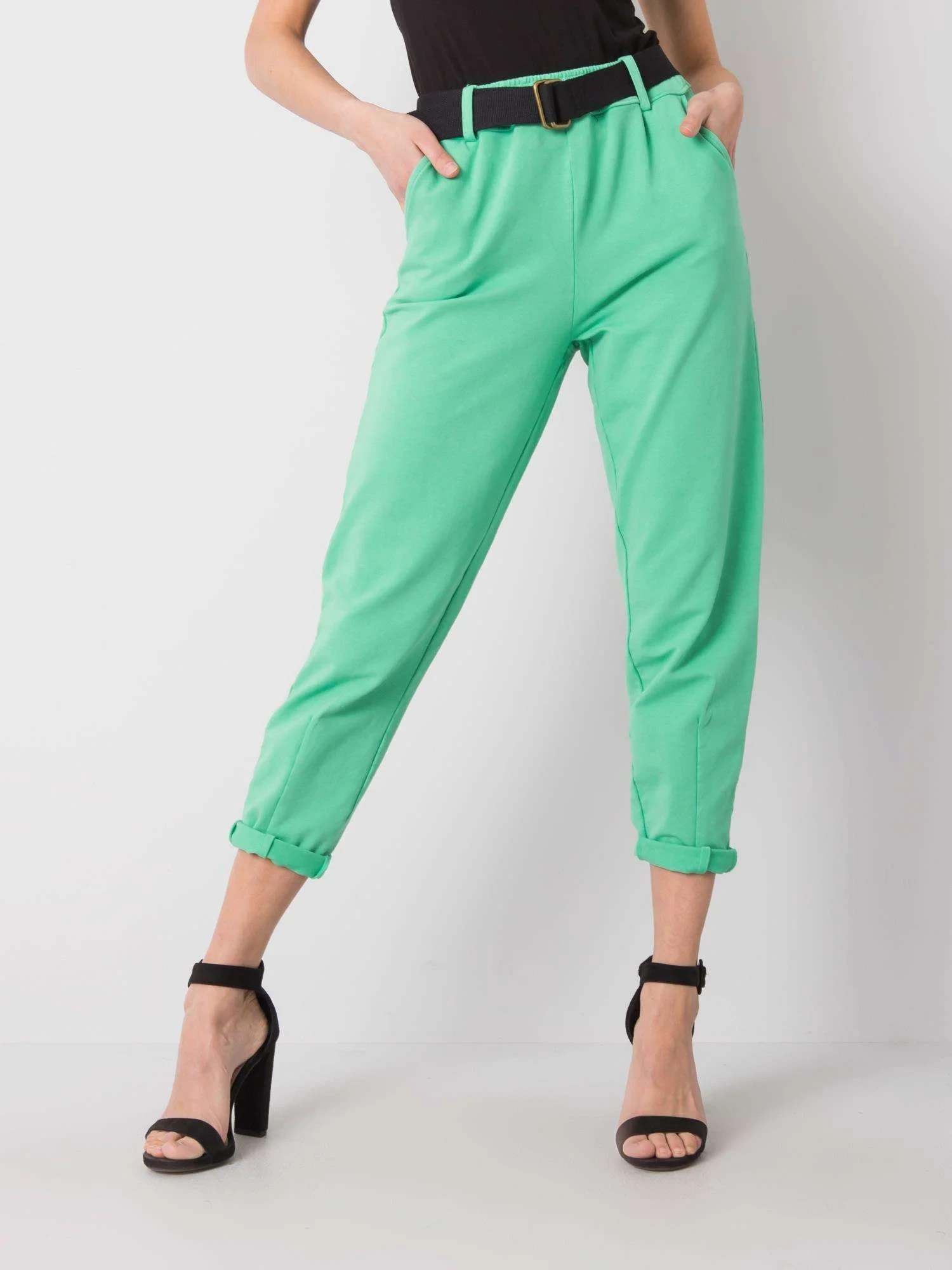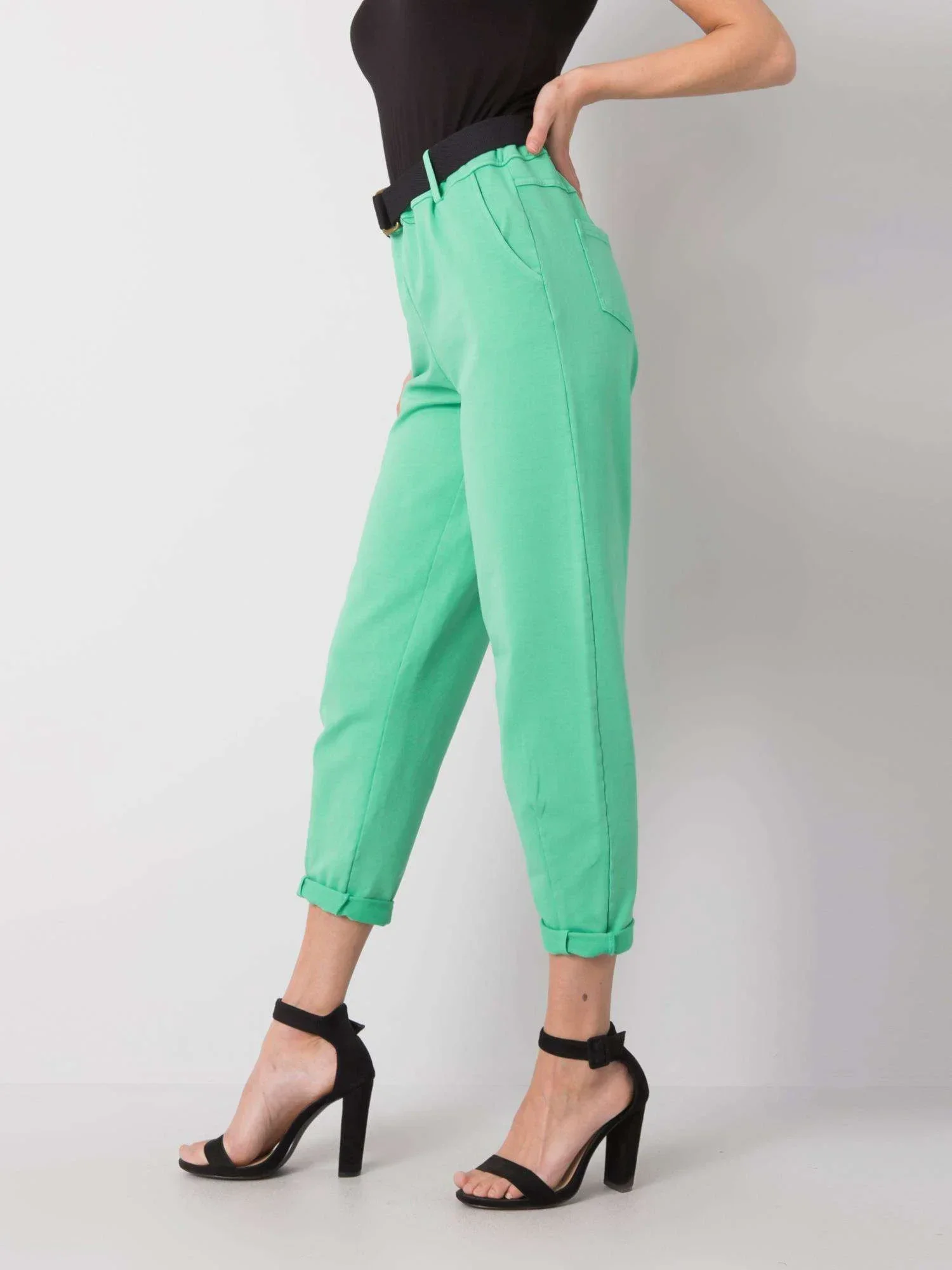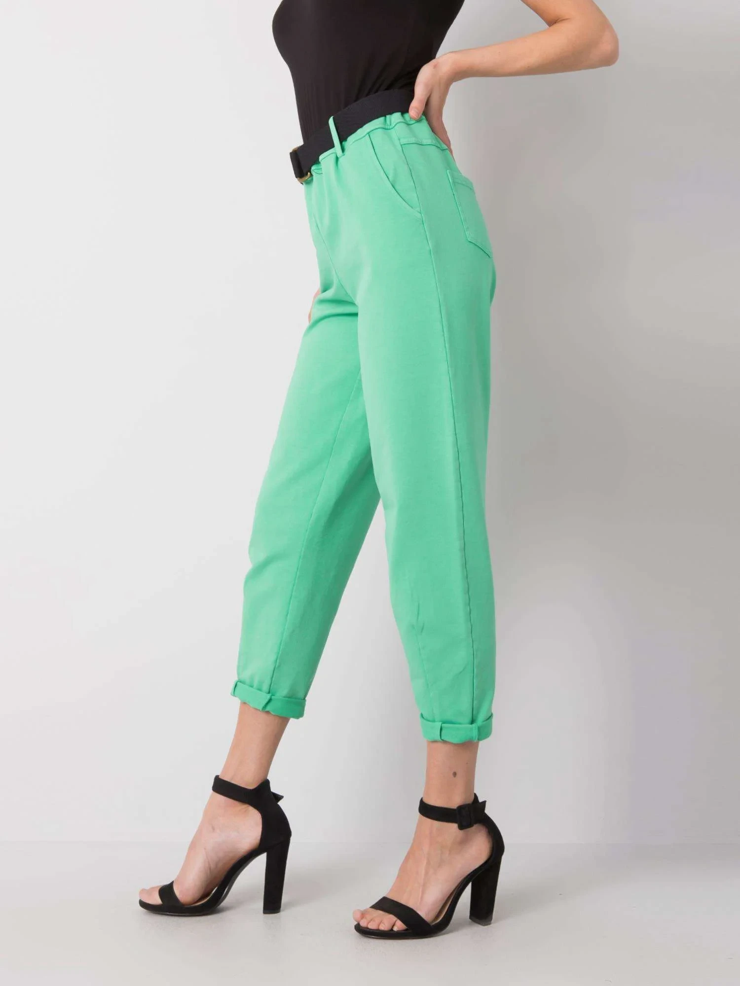 Zelené dámské kalhoty s páskem.