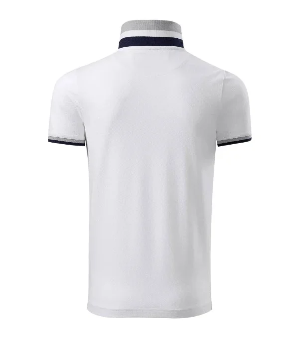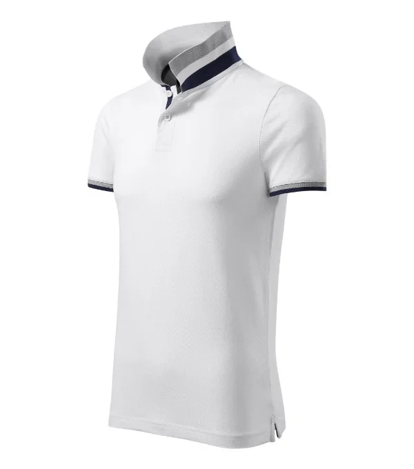 střih s bočními švy límeček a lemy rukávů z žebrového úpletu 1:1 spodní část límečku a lemy rukávů s kontrastními pruhy léga s 2 knoflíčky v barvě materiálu rozparky v bočních švech a spodní léga s kontrastní páskou vnitřní průkrčník začištěn kontrastní páskou zpevnění ramenních švů páskou