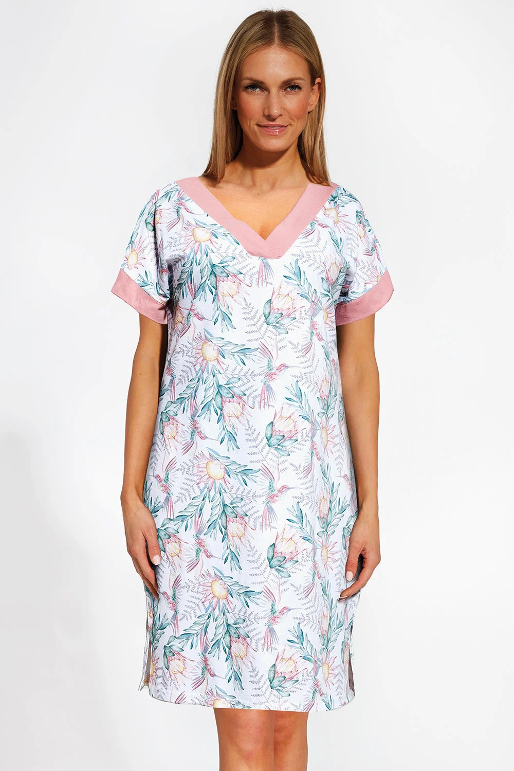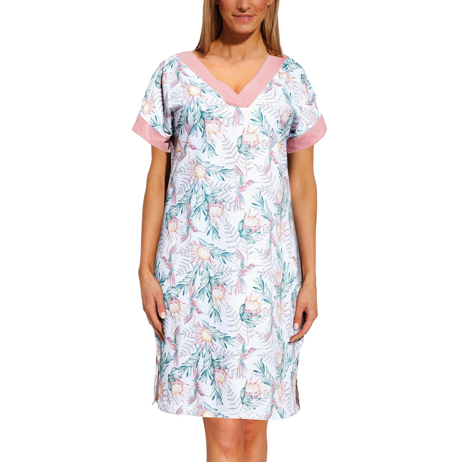 Noční košile značky Cornette, model KR Allison 3 857/266, vyrobeno ze 100% bavlny, délka rukávů: krátké, délka: midi, dámské, výstřih: špičatý.