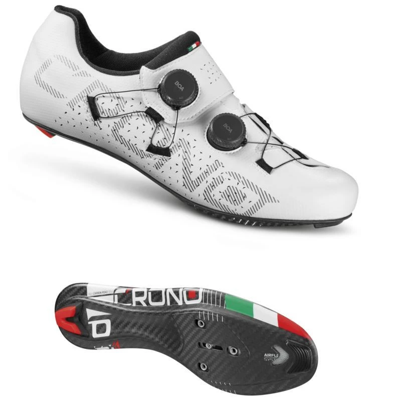 Crono CR1 je superlehká cyklistická bota s podrážkou z karbonových vláken, která kombinuje výkon s mimořádně vysokým komfortem. 6vrstvá podrážka z karbonových vláken zajišťuje přenos každého wattu energie do pedálů. Její promyšlené detaily, jako je protiskluzová podšívka a laserem navržené boční větrací otvory v kombinaci s exkluzivním zapínáním, dělají z modelu CR1 náš špičkový produkt. Spolehlivý systém zapínání Multi Contact Closure System, vyvinutý v oddělení výzkumu a vývoje společnosti CRONO, umožňuje neuvěřitelně obepínající zapínání, které rozkládá tlak na 8 bodů, čímž eliminuje ztluštění vytvářené vnitřním jazykem. Dva BOA® Li2 s potaženým ocelovým lankem umožňují přímý kontakt s botou. Systém BOA® fitting nabízí vysoký komfort nastavení a rychlé přizpůsobení.