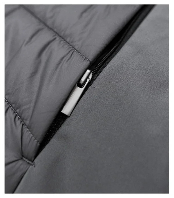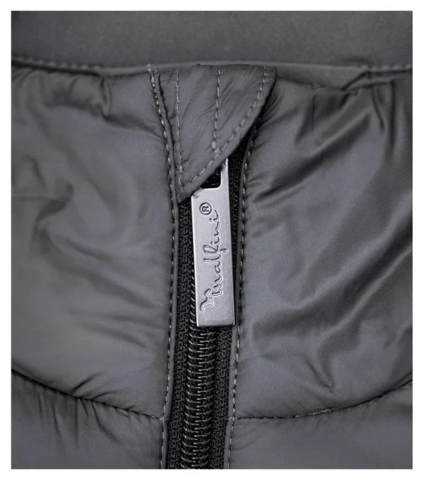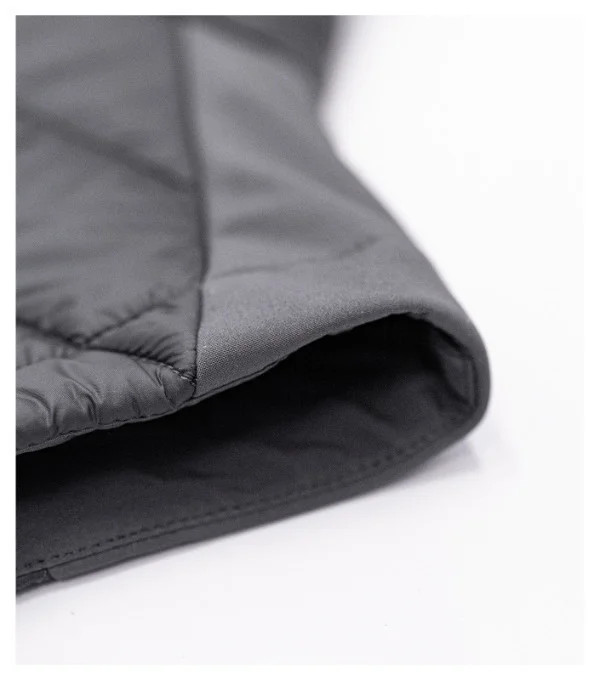 kombinace prošívaného a softshellového materiálu rovný střih s bočními díly celopropínací spirálový zip s krytkou brady boční kapsy se spirálovým zipem vnitřní náprsní kapsa na zip tvarovaný a mírně prodloužený zadní díl vstup pro branding v podšívce zadního dílu