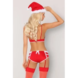 Červenobílá čtyřdílná sada z vánoční edice. Obsahuje elastickou podprsenku na gumičku, zapínanou na háčky, zdobenou dvěma bambulkami, kalhotky s mašlí, odepínacími kravatami a kožíškem nahoře, bílé punčochy na gumičku a červenou santovskou čepici. Noste ji o Vánocích i po nich! Složení: 88 % polyester, 12 % elastan.