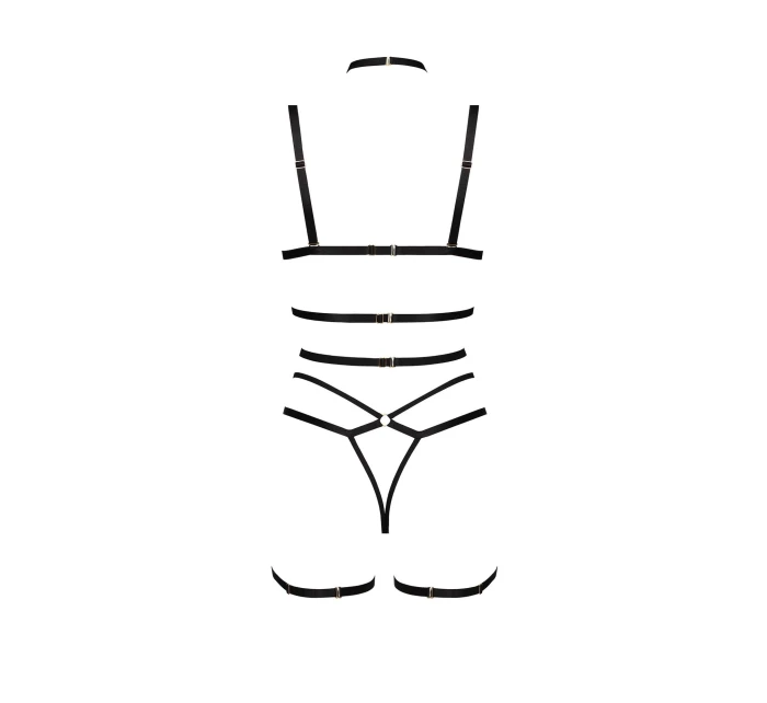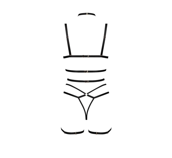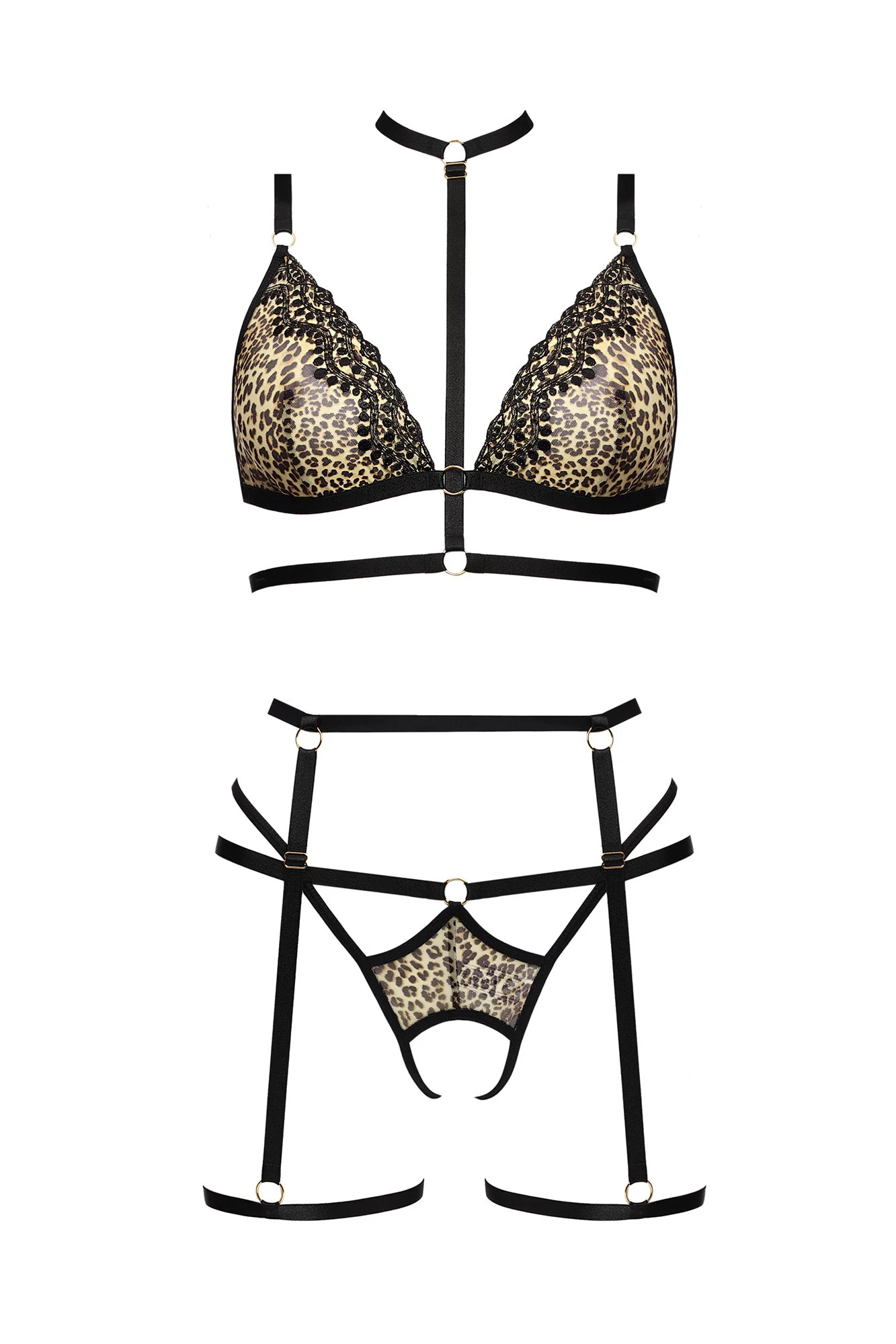 Sexy čtyřdílná souprava spodního prádla, ve které upoutáte jeho pohledy. Je vyrobena z jemné, elastické látky v teplých barvách, zdobená krásným leopardím motivem. Souprava obsahuje: měkkou podprsenku, pikantní otevřená tanga, okouzlující pásek s elastickými podvazky na stehnech a ozdobu na krku. Všechny pásky jsou tenké, jemné elastické pásky s nastavitelnou délkou, zdobené zlatými sponami a zlatými kroužky. Složení: 80 % polyamid, 20 % elastan.