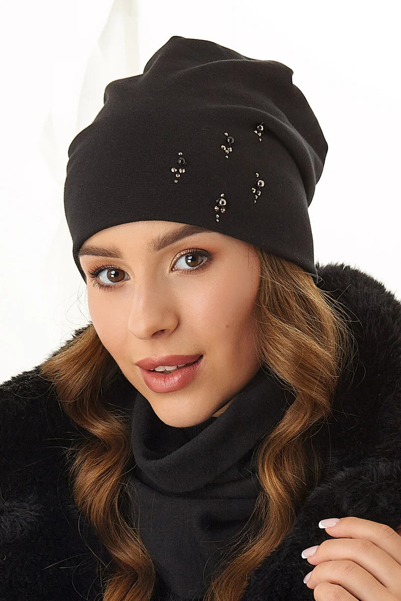 Dámský klobouk z podkladu z hřejivé bavlny, zdobený korálky. Přechodný model, ideální pro lidi, kteří nemají rádi tlusté klobouky.