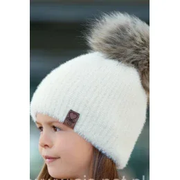 Dívčí čepice s bambulí, vyrobená ze spodníóy vrstvy nadýchaného polyamidu.