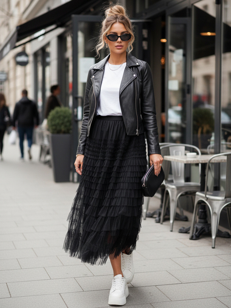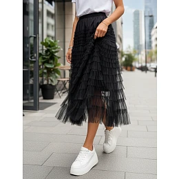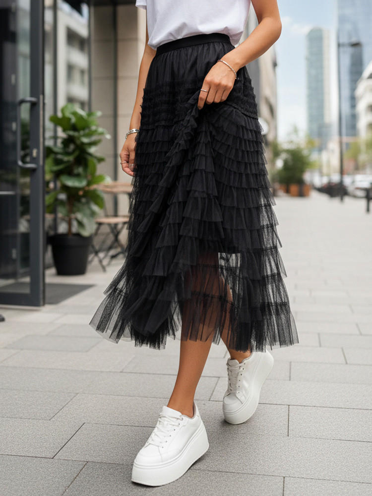 Tiulowa spódnica o długości maxi to niezmiennie bezbłędny wyznacznik trendów. Modna długość, gumka w pasie, ciekawe przeszycia tiulu tworzą stylową całość. Idealnie zaprezentuje się zarówno w eleganckim, jak i casualowym wydaniu. Dostępna w trzech kolorach.