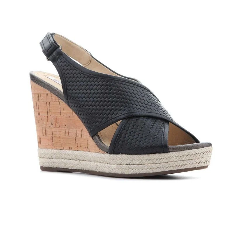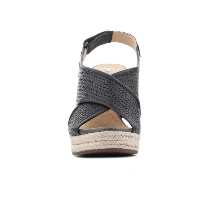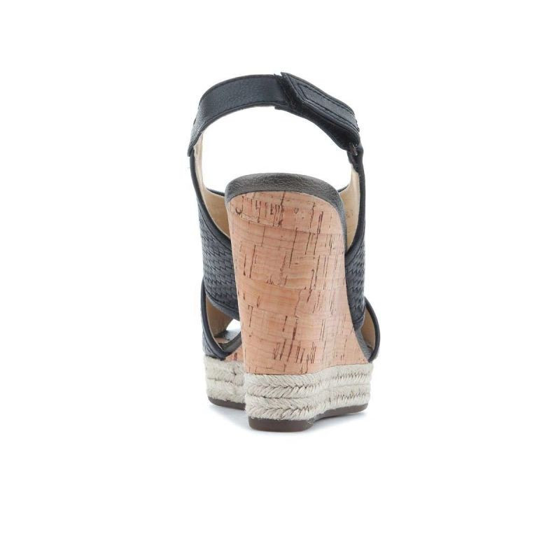 Dámské letní sandály na korkovém podpatku, černý svršek s pletenou strukturou, nastavitelný pásek za patou s páskem na suchý zip, 10 cm podpatek, 2 cm silná podrážka s pletenou šňůrkou po celém obvodu, doporučujeme na jaro a léto 2018!