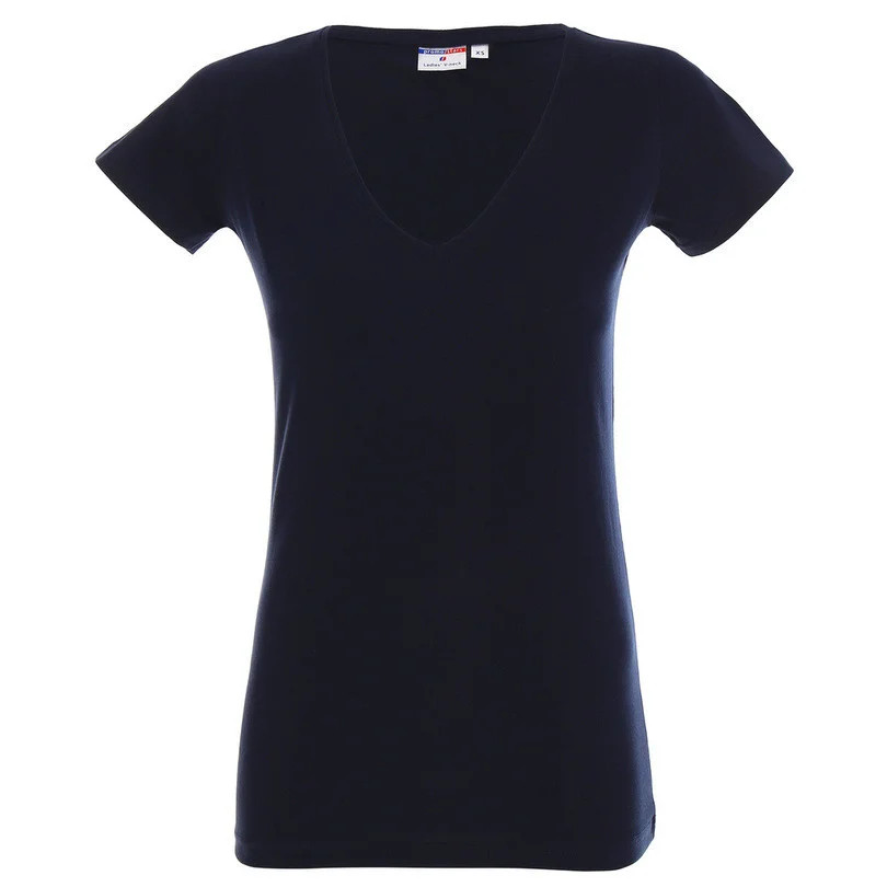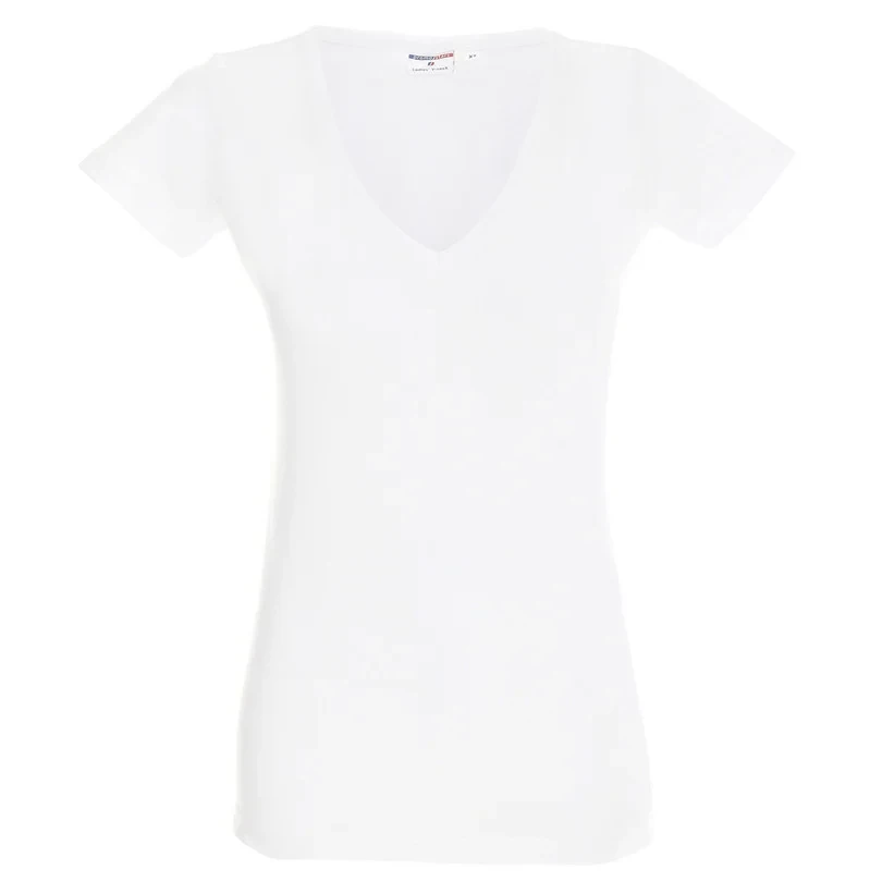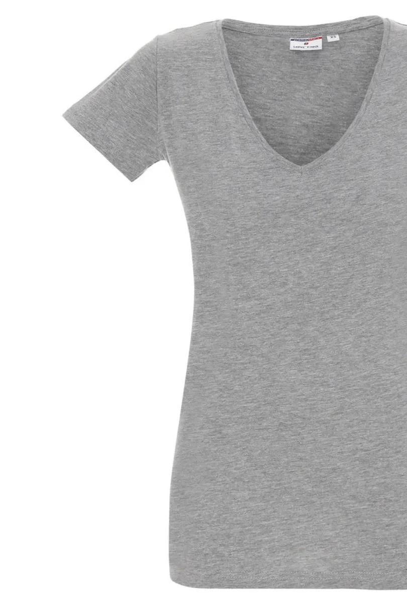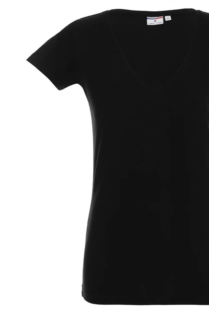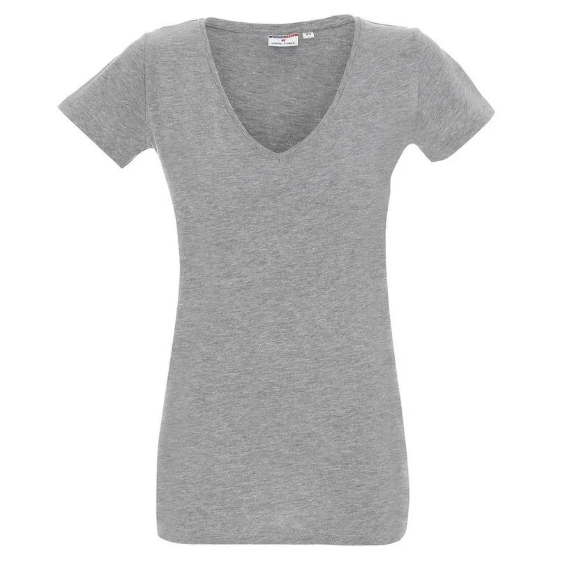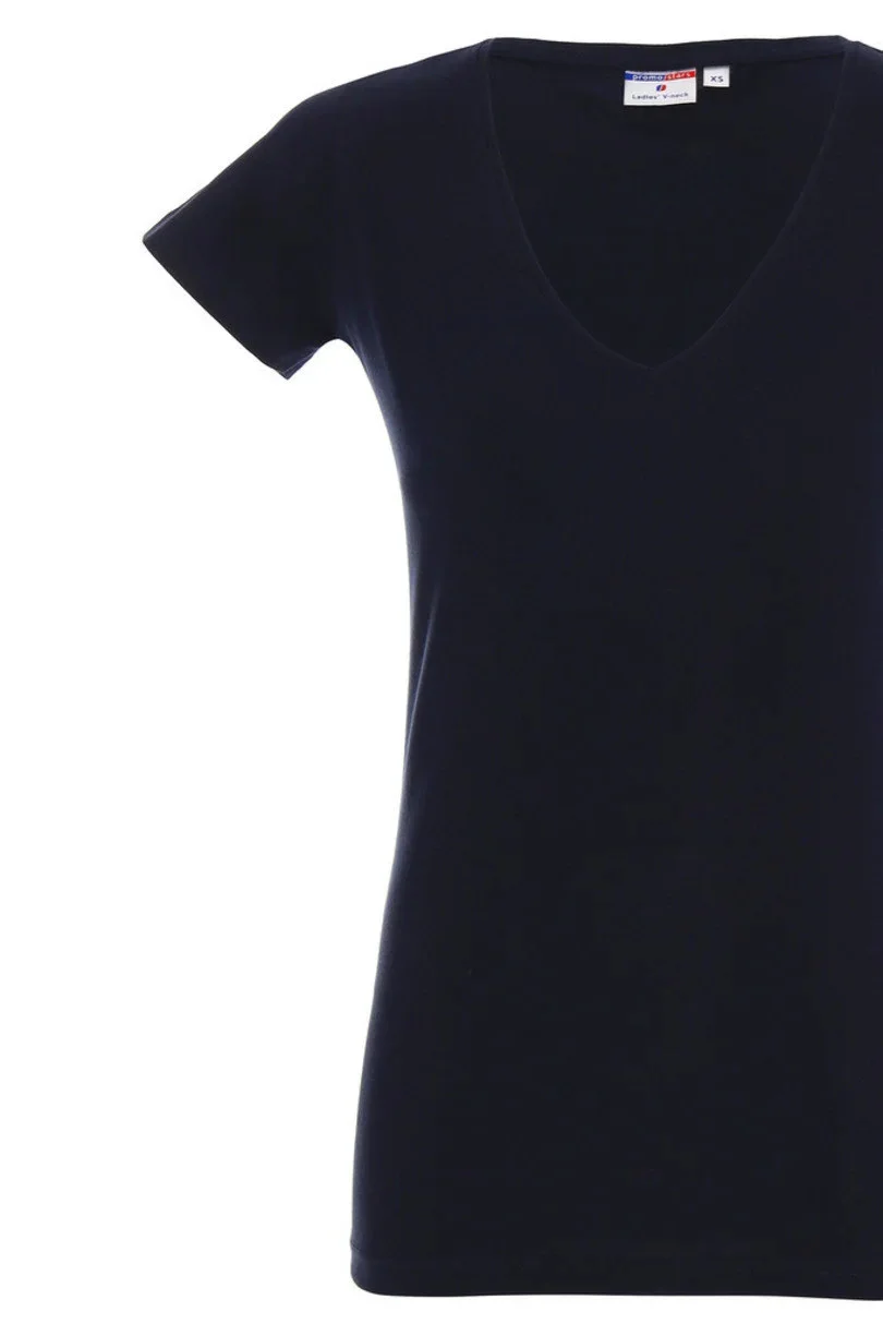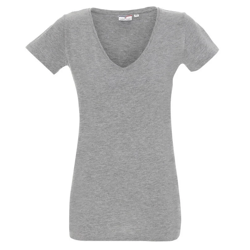 Dámské tričko s výstřihem do V. Ušité z hladkého materiálu single jersey, má elastický lem a dvojté švy. Gramáž: 160g/m2
