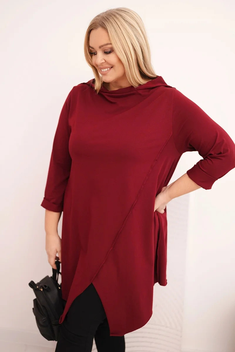 Dámská asymetrická bavlněná blůza Plus Size s ohrnovacími rukávy bordová