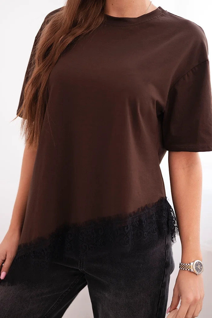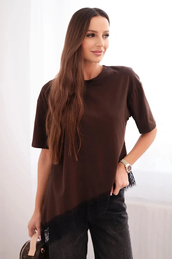Dámská asymetrická bavlněná blůza s krajkou dole hnědá