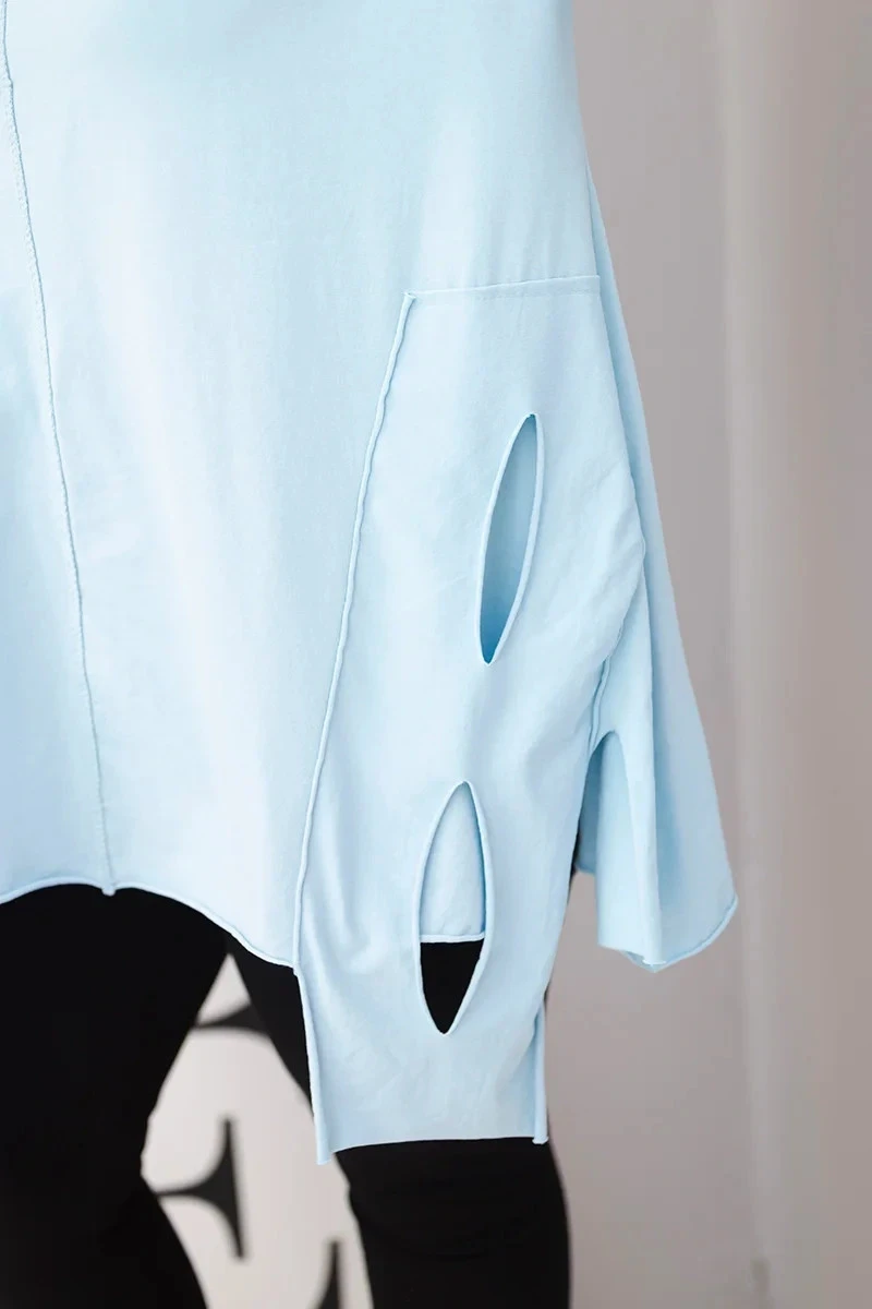 Blůza byla vyrobena ze 100 % přírodní bavlny, což zaručuje prodyšnost a pohodlí po celý den. Dlouhý rukáv a volný střih ji činí ideální volbou jak na běžné nošení, tak na setkání v neformálním stylu. Výjimečný design s ozdobnými výřezy po stranách přitahuje pozornost a umožňuje vytvořit neobvyklý styl.
