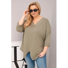 Dámská bavlněná blůza Plus Size s hlubokým výstřihem ve tvaru V a asymetrickým spodním model 21917131 khaki - K-Fashion