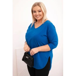 Dámská bavlněná blůza Plus Size s V výstřihem a ohrnutým rukávem chabrová