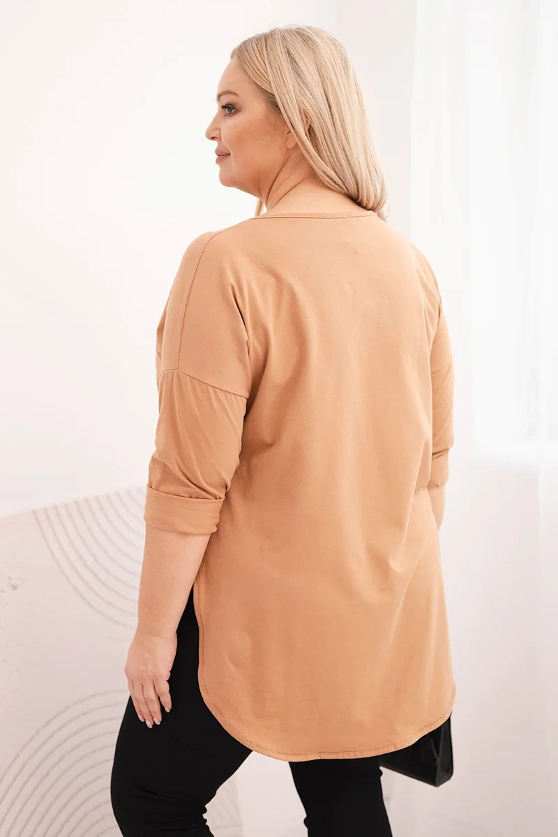 Dámská bavlněná blůza Plus Size s výstřihem do V a ohrnutými rukávy camelová