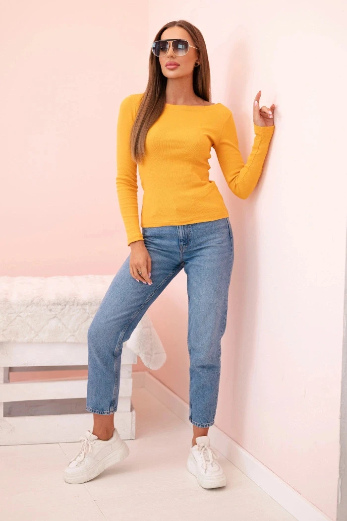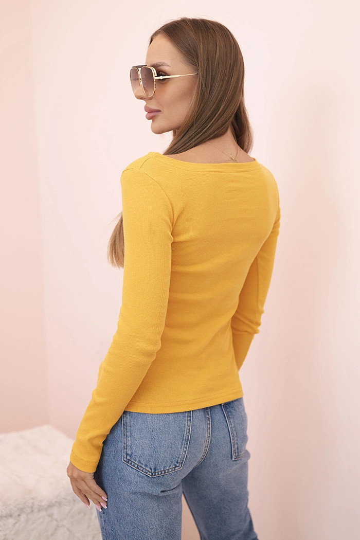 Dámská bavlněná blůza s dlouhým rukávem a lodičkovým výstřihem musztardová