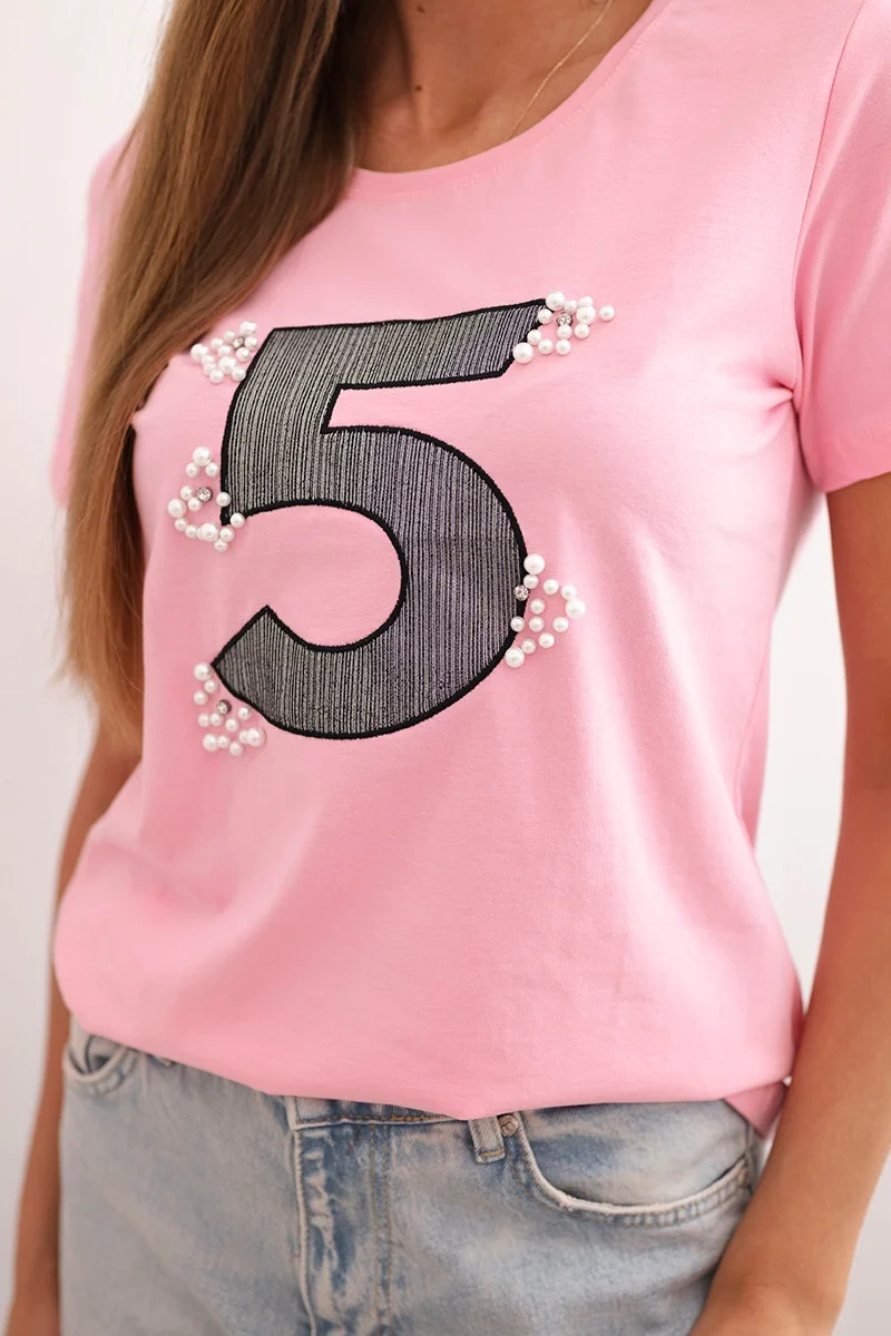 Dámská bavlněná blůza s krátkým rukávem a nášivkou s perlami světle růžová