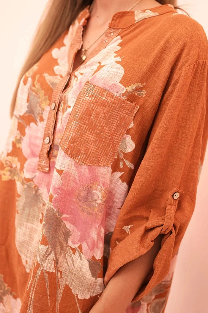 Romantická a lehká dámská halenka vyrobená ze 100% přírodní bavlny, která zajišťuje výjimečné pohodlí a prodyšnost i během teplých dnů. Model je ozdoben velkým květinovým vzorem a jemným leskem drobných flitrů na kapsičce. Střih s výstřihem do V a částečným zapínáním na knoflíky zdůrazňuje ženský styl, zatímco zaoblená zadní část a rukávy s možností ohrnutí dodávají ležérní charakter. Skvělý tip ke džínům, plátěným kalhotám nebo lehké sukni.