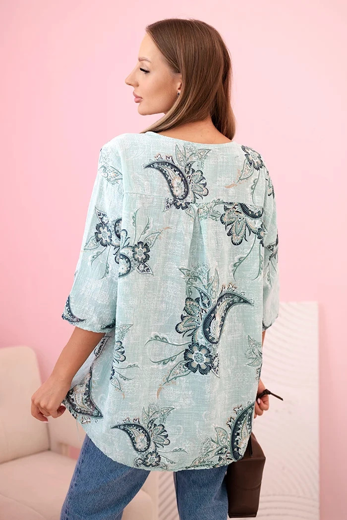 Dámská bavlněná blůza s ohrnutým rukávem a vzorem model 21202215 mátová - K-Fashion
