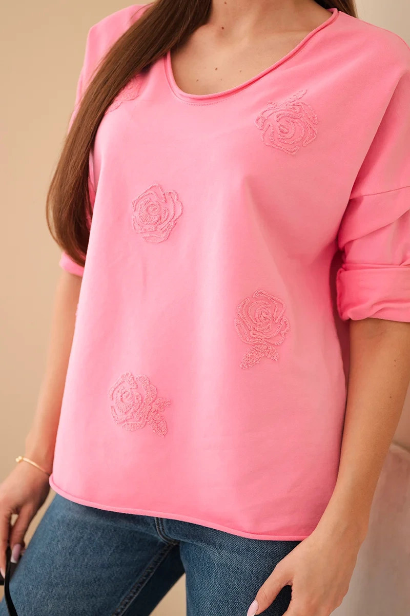 Dámská bavlněná blůza s vyšívanými květinami a V výstřihem růžová