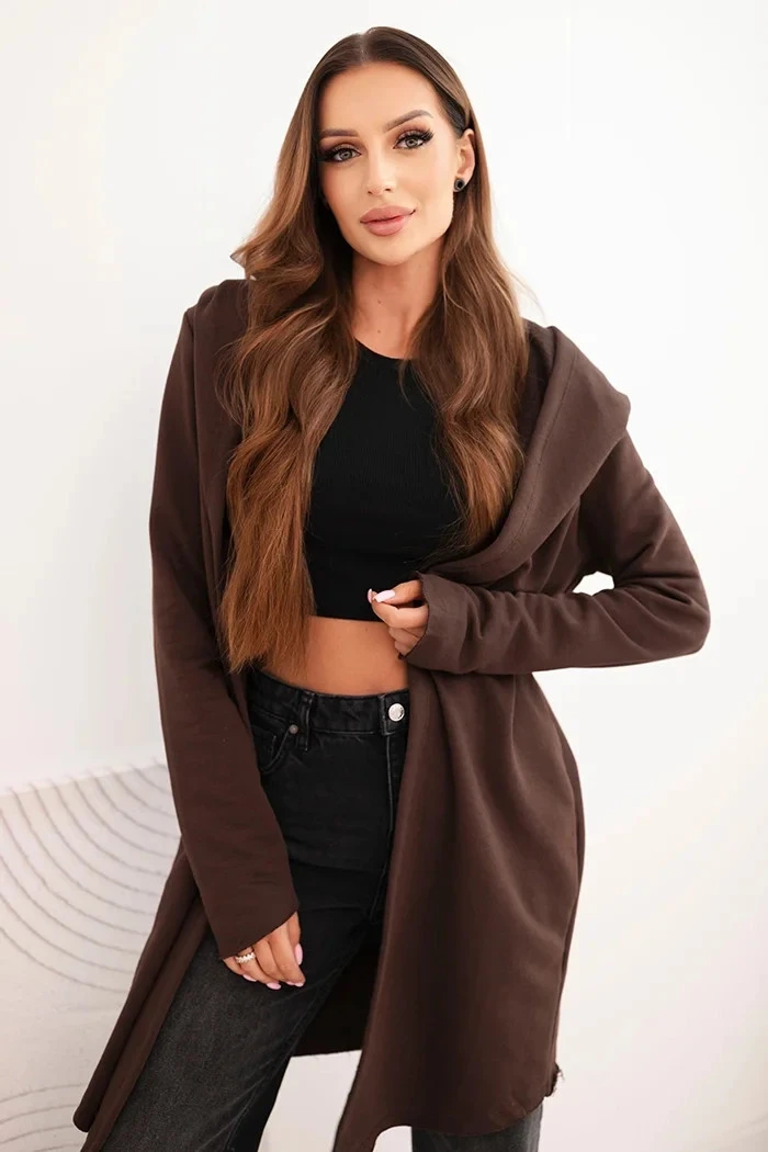 Dámská bavlněná bunda s kapucí a prodlouženým předním dílem hnědá